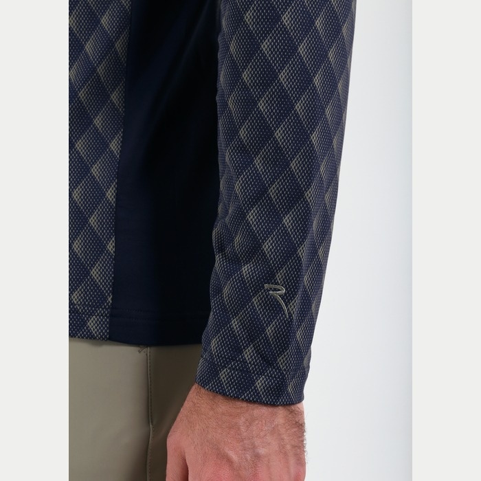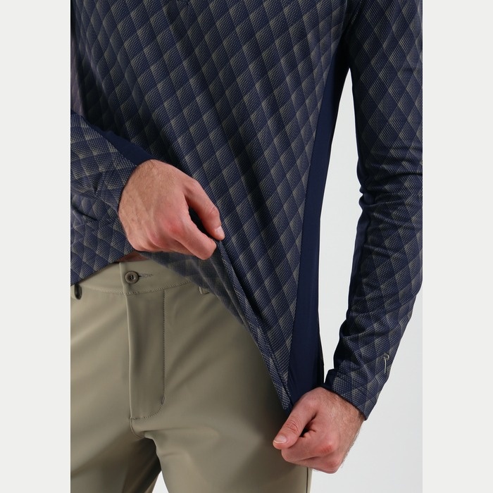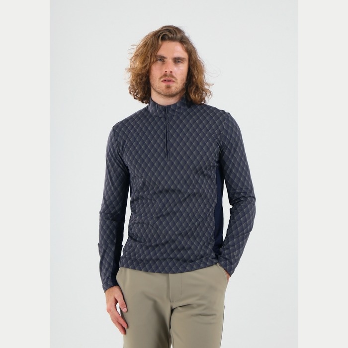 このハーフジップトップは、ブラッシュドジャージー生地を使用し、オプティカルとロゴのプリントが施されています。高い伸縮性と優れた手触りで、寒い天候でも暖かく快適に過ごせます。内側は柔らかくブラッシングされており、シンプルでありながらアイコニックなデザインが魅力です。日常使いやアウトドアに最適な一着です。