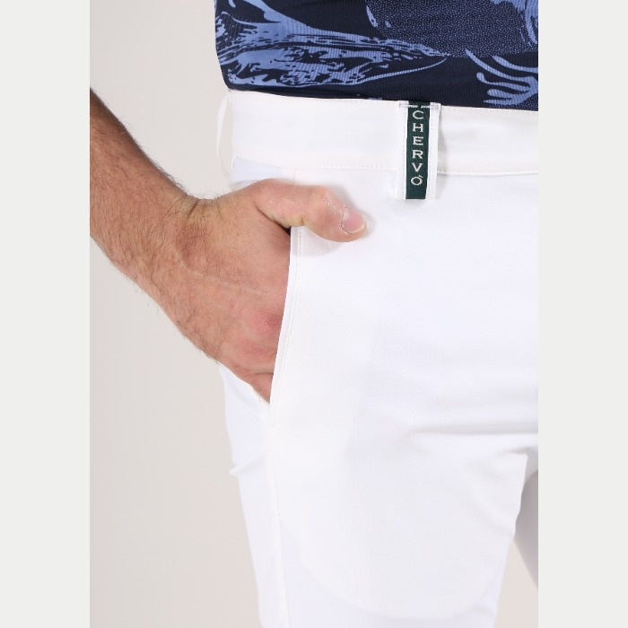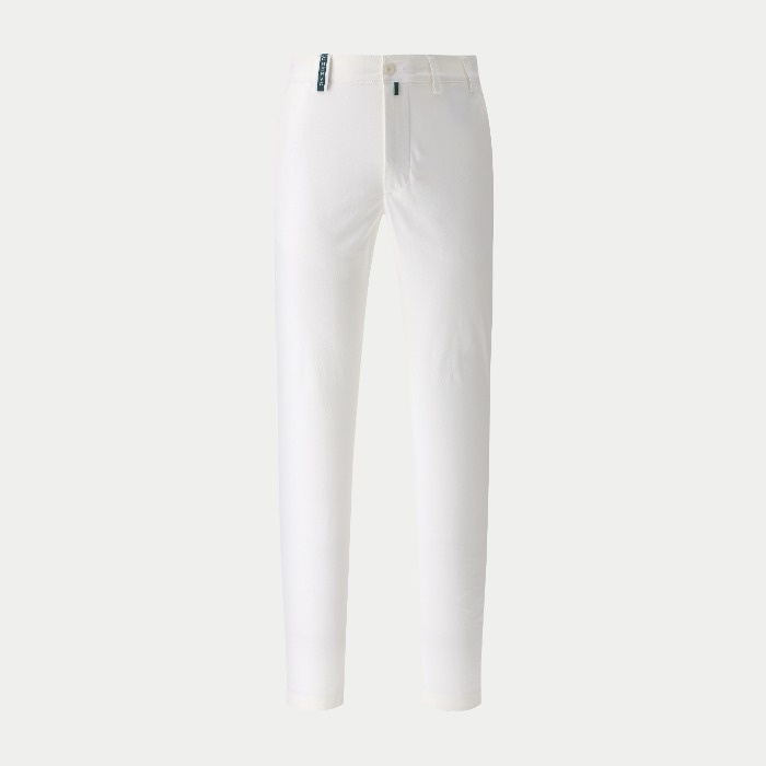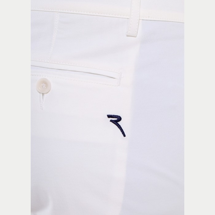 UVカット機能のついた無地のパンツ。裾幅は17㎝。後ろのポケット口は両玉縁タイプ。右後ろポケットサイドにRマークの刺繍があります。