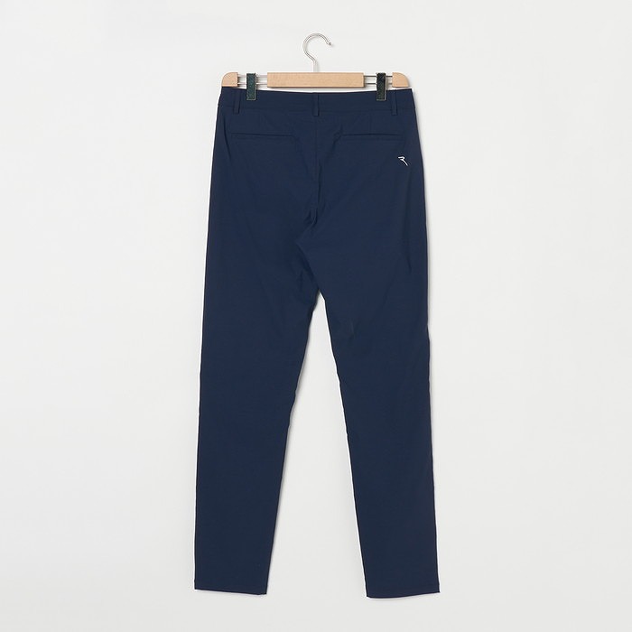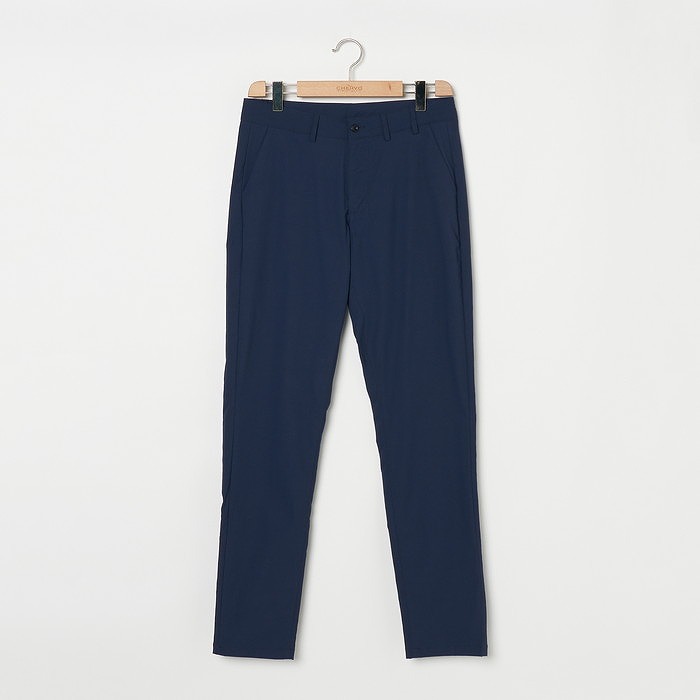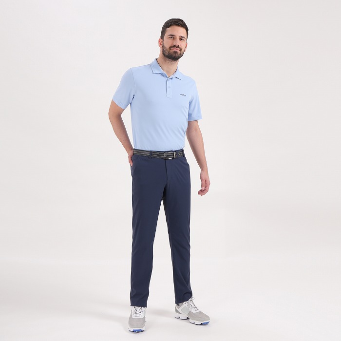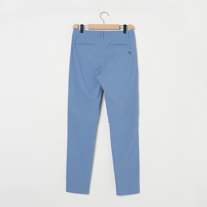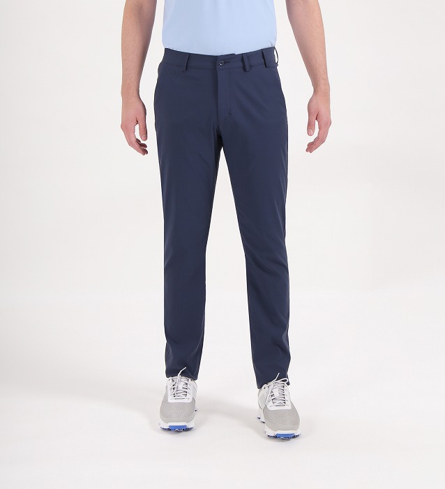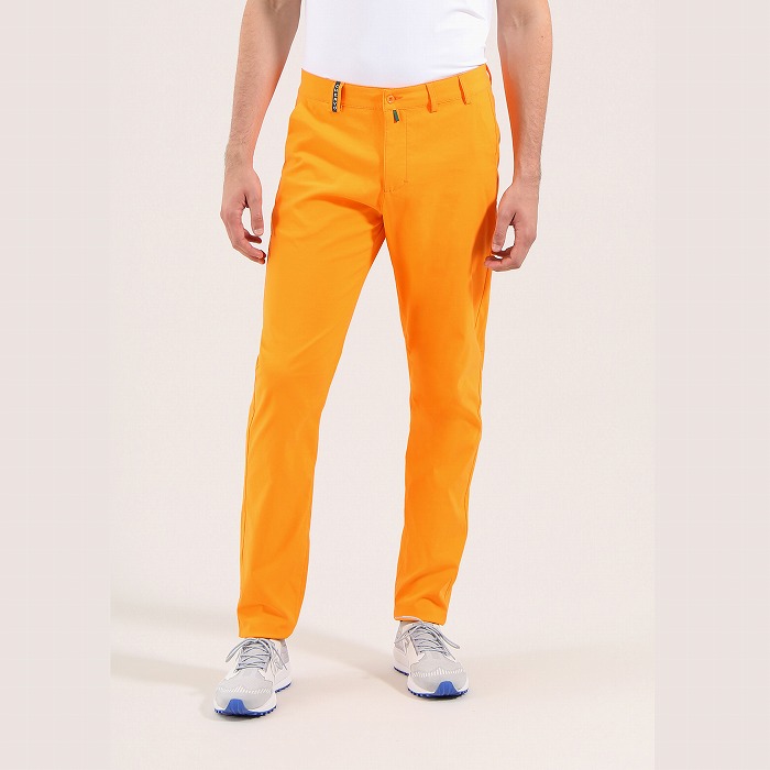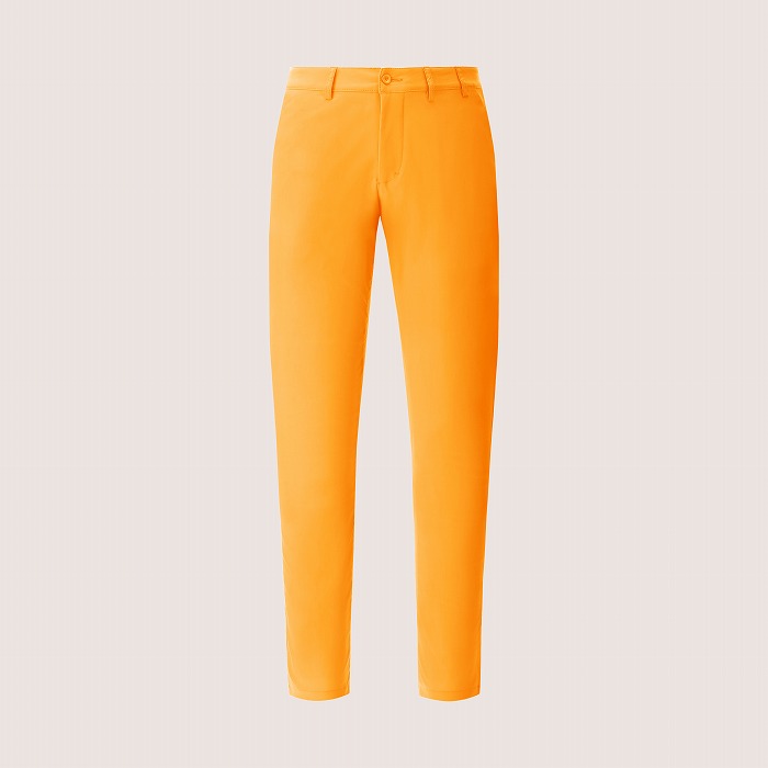 コットンのような肌触りの生地のミッドシーズン メンズパンツ。素材はナイロン/ポリウレタンとなります。裾幅17cm。 素材機能としては、吸水速乾、UVカット、ストレッチとなります。ウェストの開閉はダブルボタンとファスナーになり、さわやかで着心地がよく、スリムなフィット感がデザインを引き立てます。