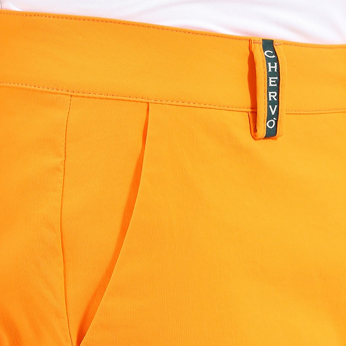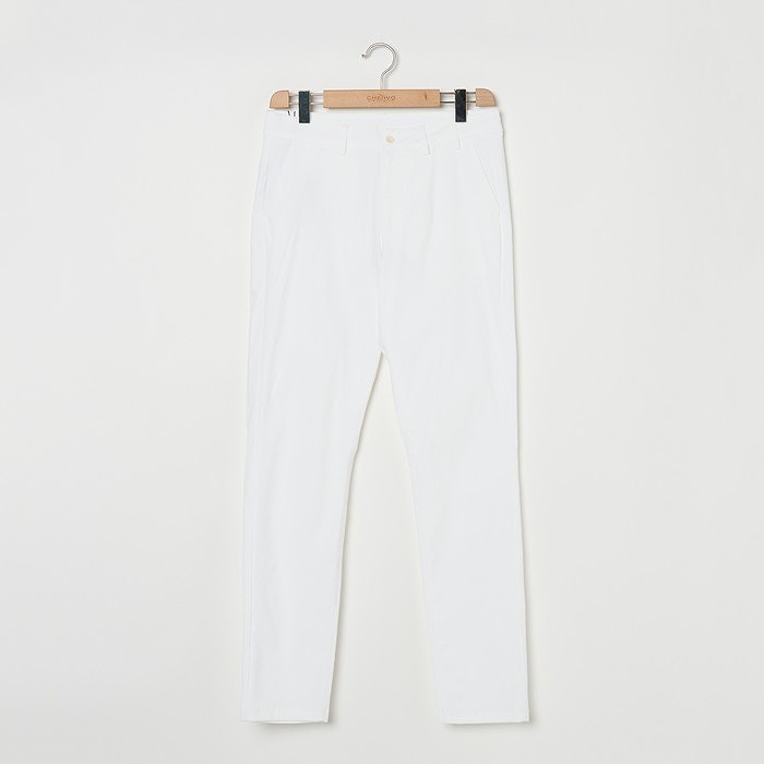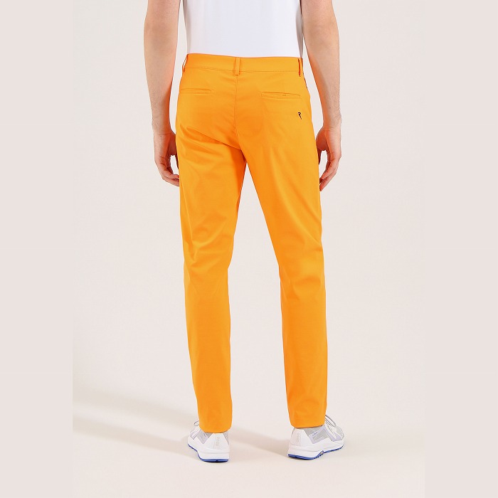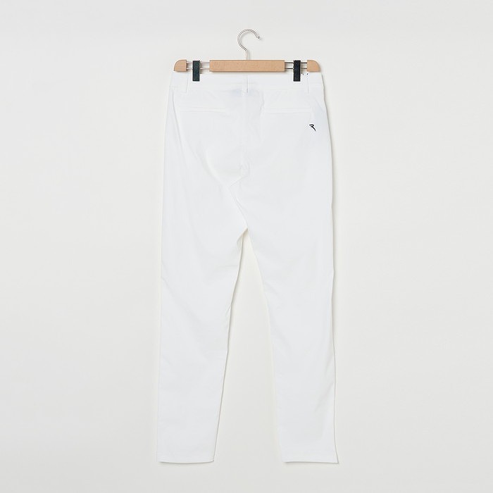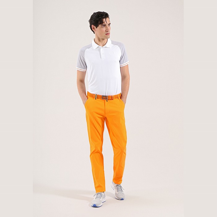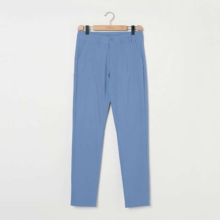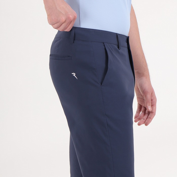 コットンのような肌触りの生地のミッドシーズン メンズパンツ。素材はナイロン/ポリウレタンとなります。裾幅17cm。 素材機能としては、吸水速乾、UVカット、ストレッチとなります。ウェストの開閉はダブルボタンとファスナーになり、さわやかで着心地がよく、スリムなフィット感がデザインを引き立てます。
