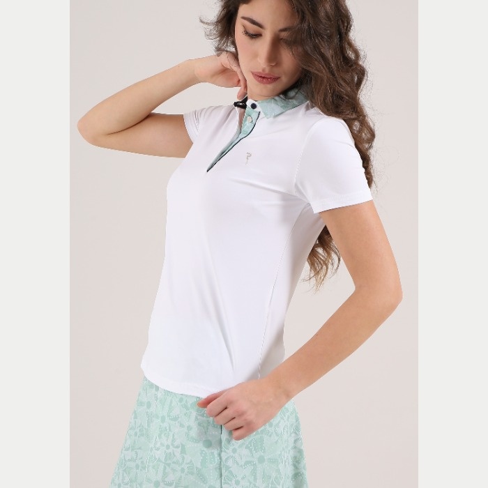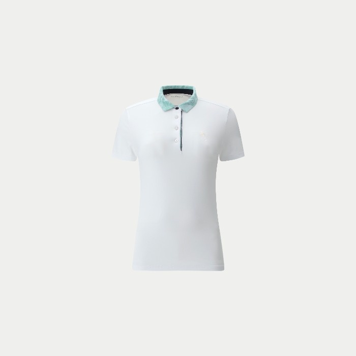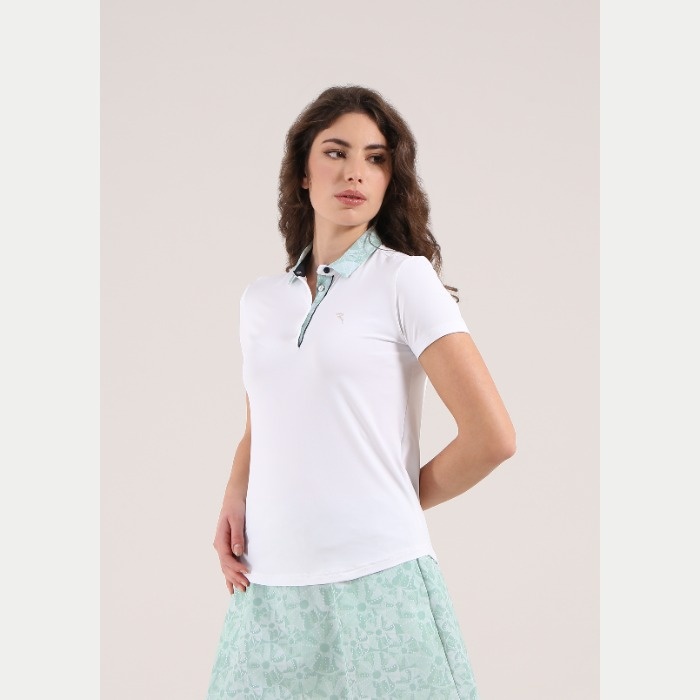 前立てと襟部分にプリントの生地をはめ込んだ半袖ポロシャツ。素材機能としては、吸水速乾、UVカットとなります。