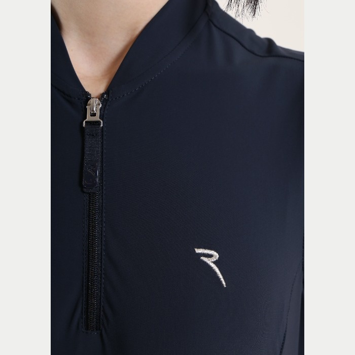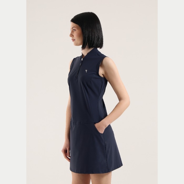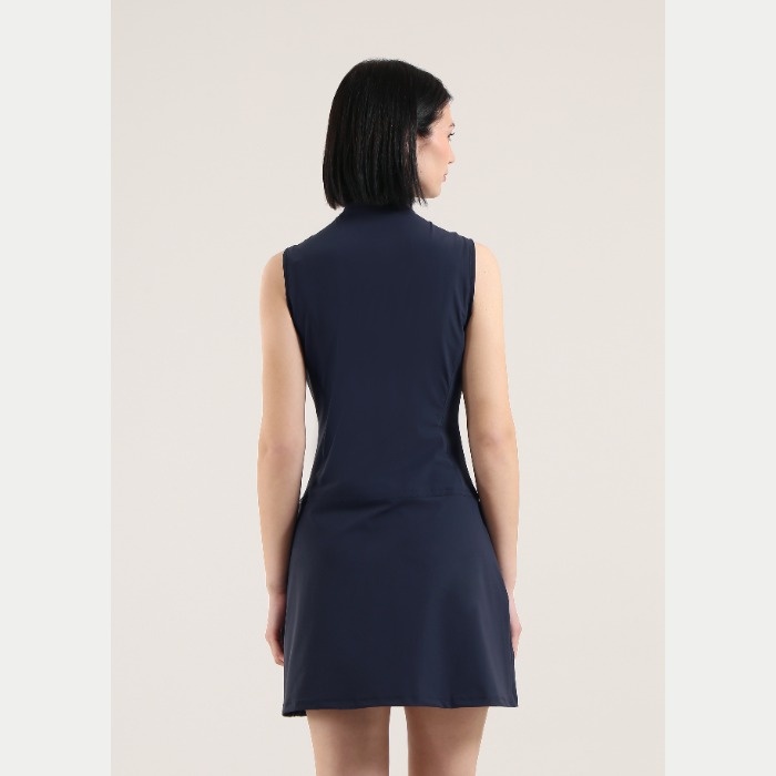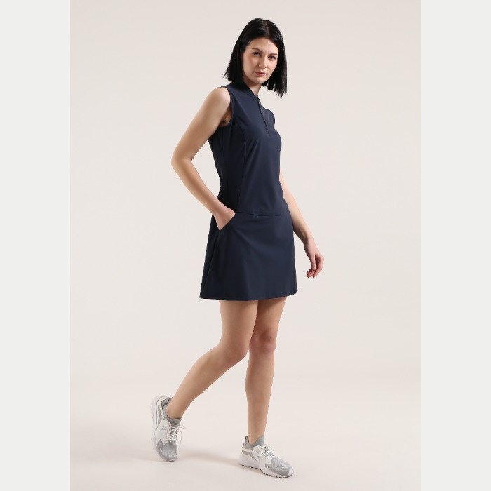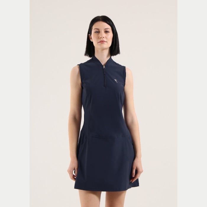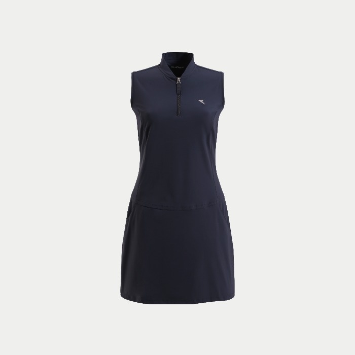無地のノースリーブワンピース。前立てはジップアップとなります。着丈88cm。ウエスト部分にティーホルダーあり。素材はナイロン/ポリウレタンで、素材特性はUVカット、吸水速乾、4WAYストレッチとなります。