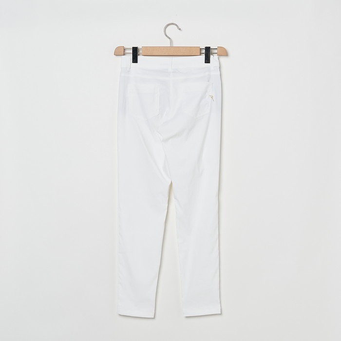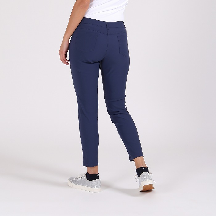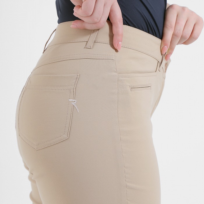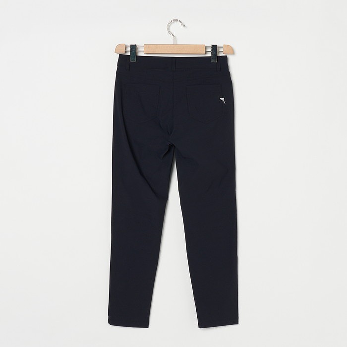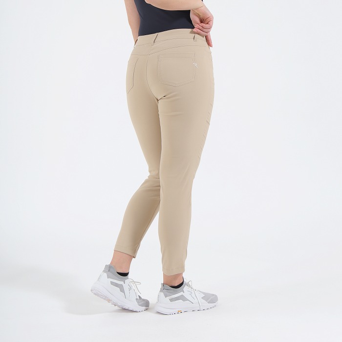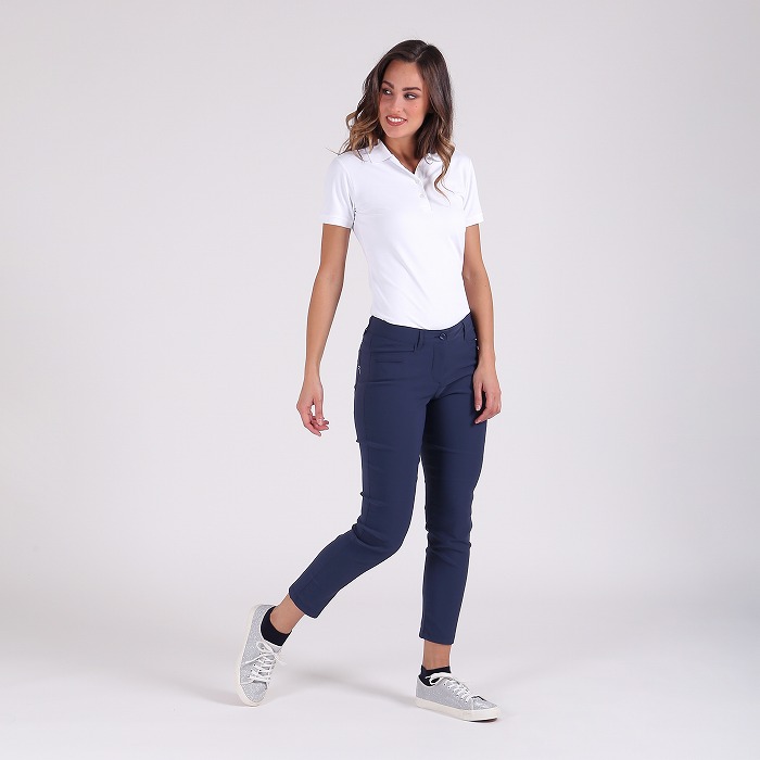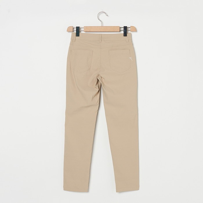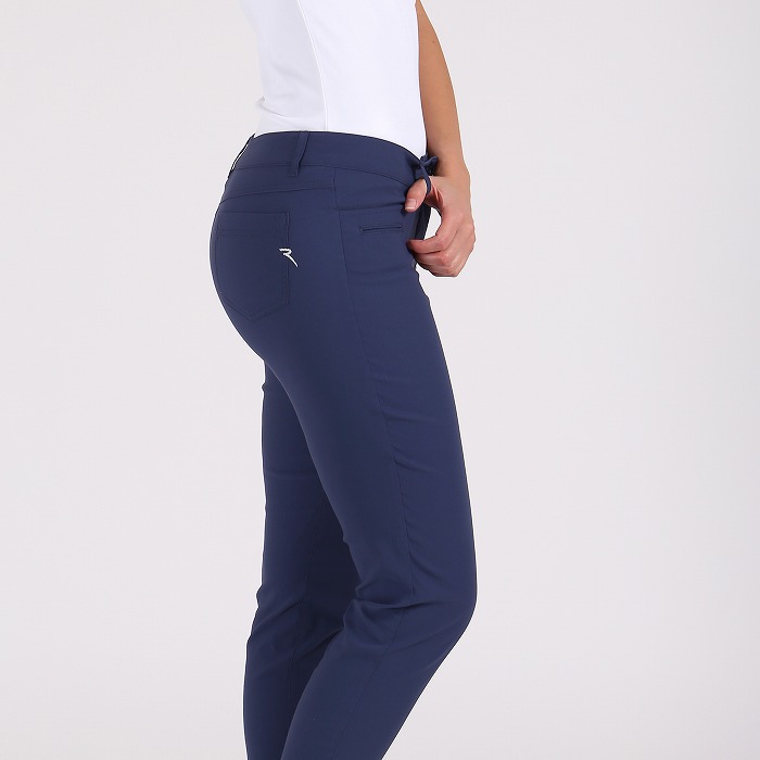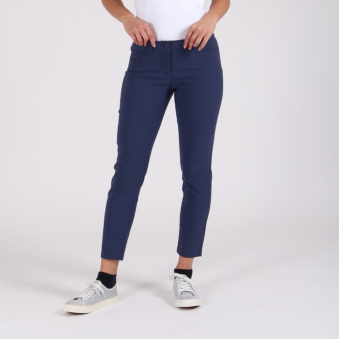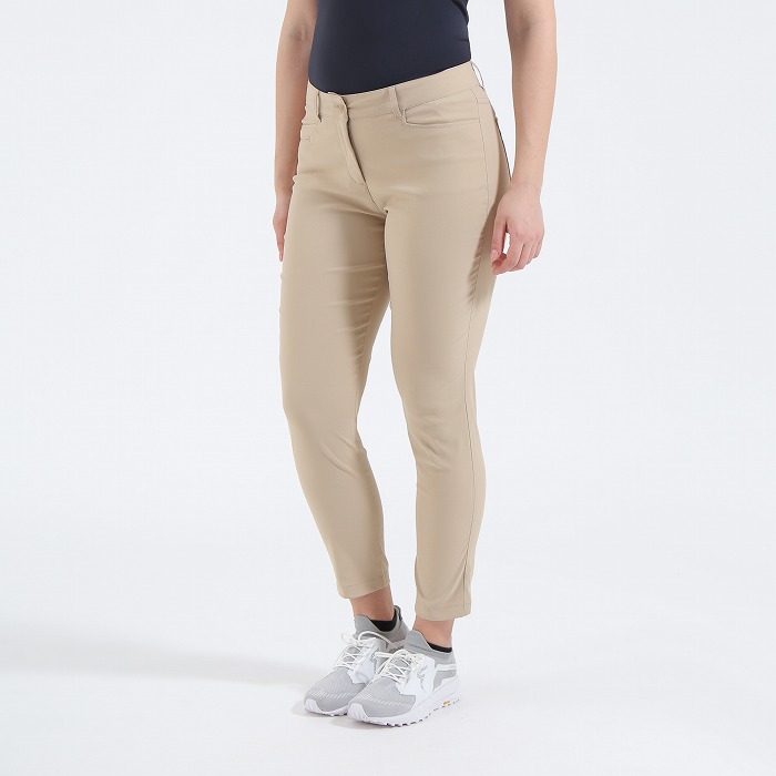 吸水速乾、UVカット、ストレッチが素材特性のレディースパンツ。 股下70㎝。裾幅14㎝。コットンのような見た目と肌触りで快適なストレッチ素材となります。後ろのコントラストの刺繍とパッチ ポケットが、スポーティーで本質的なイメージを与えます。素材はナイロン/ポリウレタンとなります。