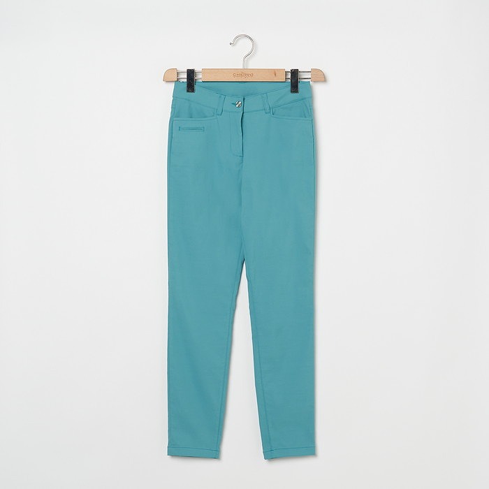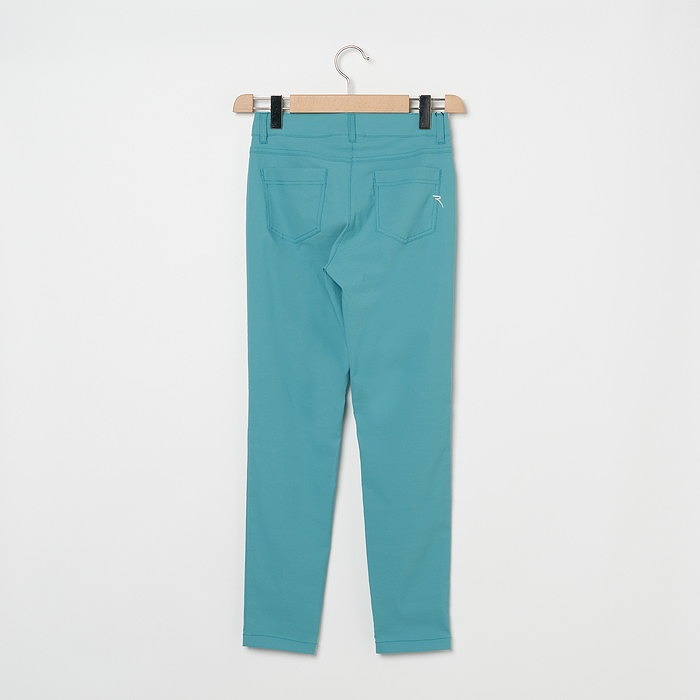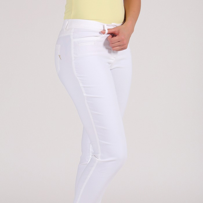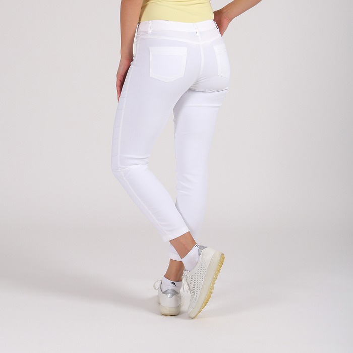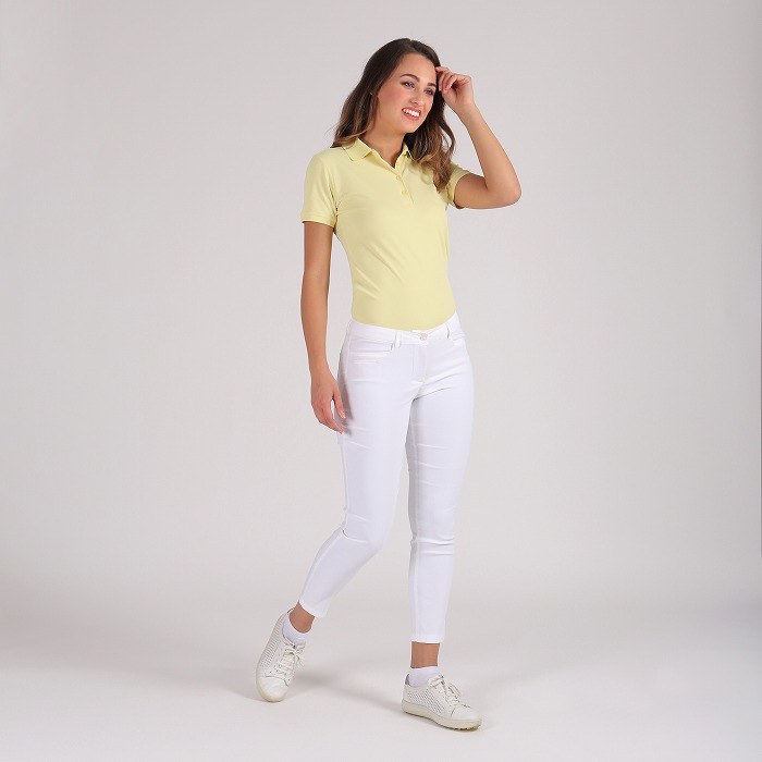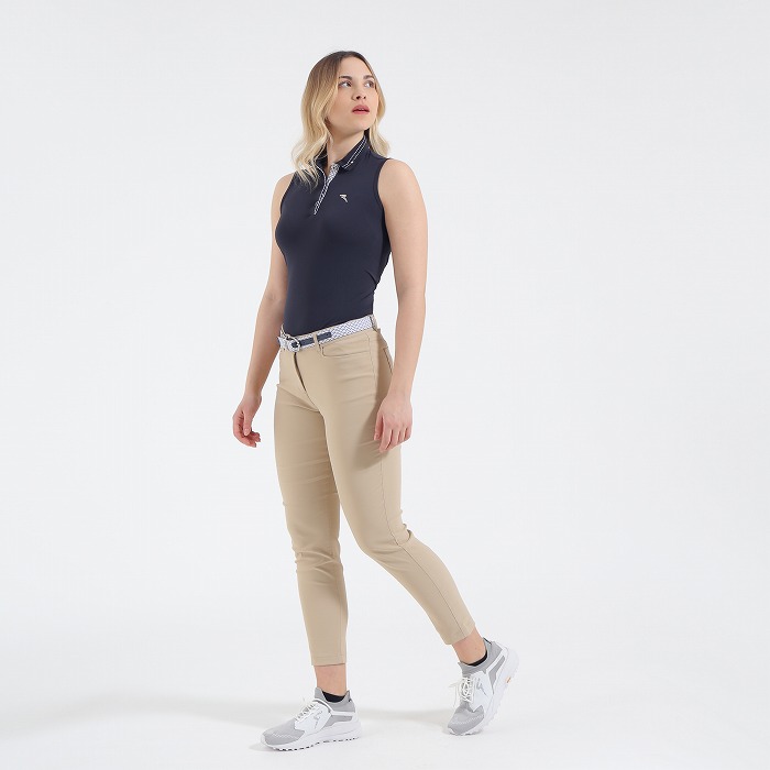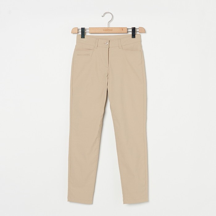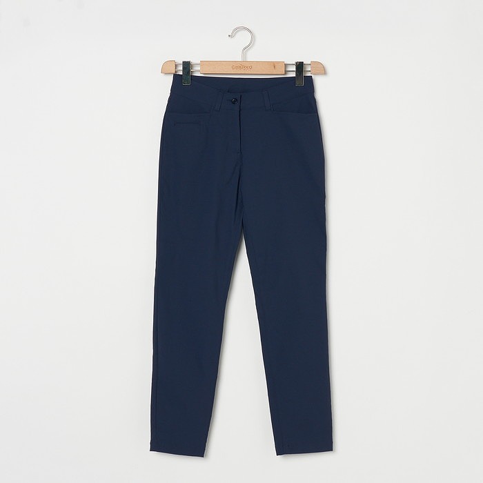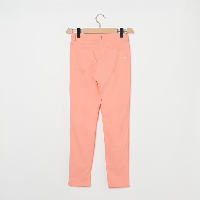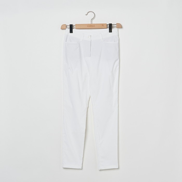 吸水速乾、UVカット、ストレッチが素材特性のレディースパンツ。 股下70㎝。裾幅14㎝。コットンのような見た目と肌触りで快適なストレッチ素材となります。後ろのコントラストの刺繍とパッチ ポケットが、スポーティーで本質的なイメージを与えます。素材はナイロン/ポリウレタンとなります。