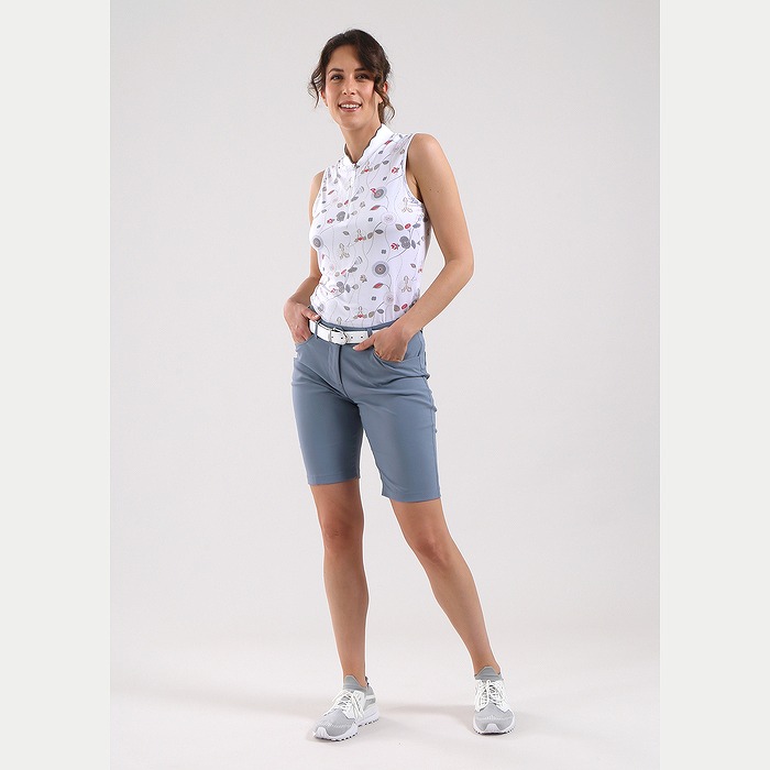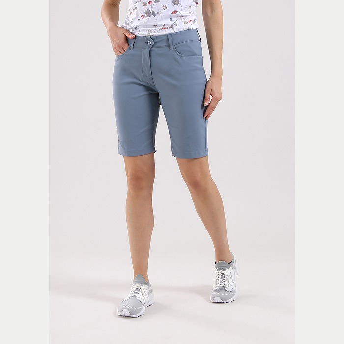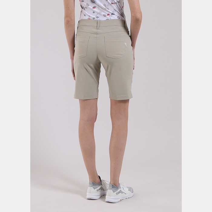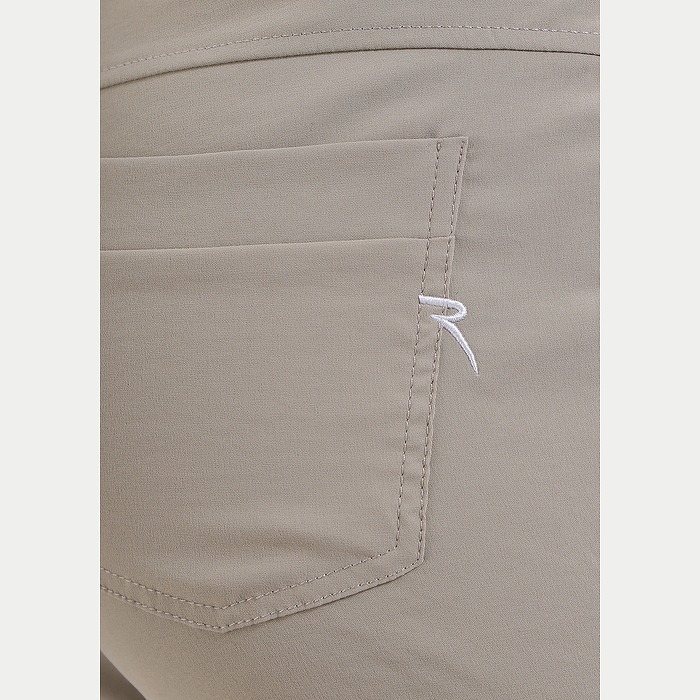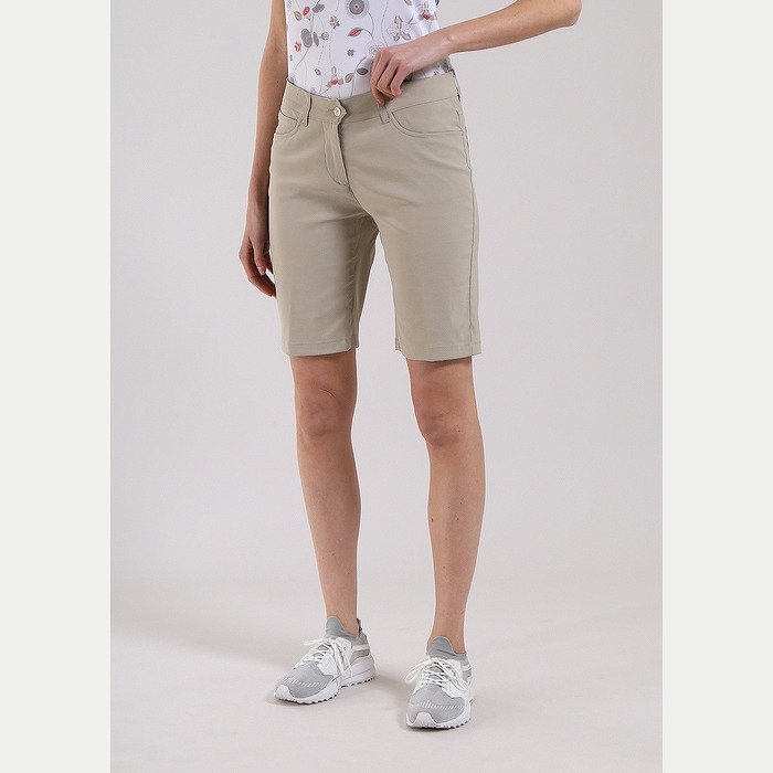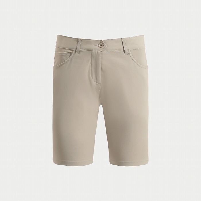 吸水速乾、UVカット、ストレッチが素材特性のレディースバミューダパンツ。 股下25㎝。裾幅22㎝。コットンのような見た目と風合いを備えた快適なストレッチ素材。ポケットは5ポケットタイプ。前面は同色のボタンとファスナーでの開閉、背面はR刺繍とパッチポケットがデザインポイントなります。素材はナイロン/ポリウレタンとなります。