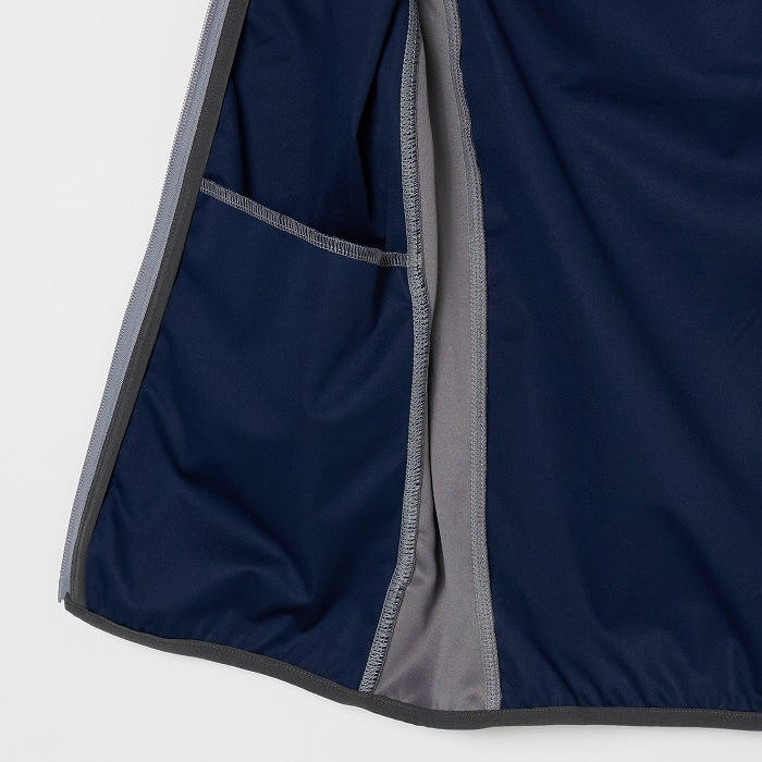 中間層の特殊フィルム(透湿防水性フィルム)により、生地に防水性能を持たせつつ、透湿性を確保することで、洋服内がむれにくくなっており、水は通さないが、蒸れにくいという一見矛盾する機能を両立した素材です。