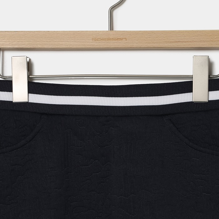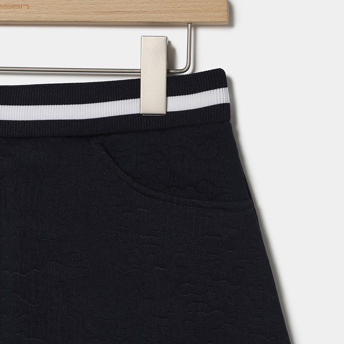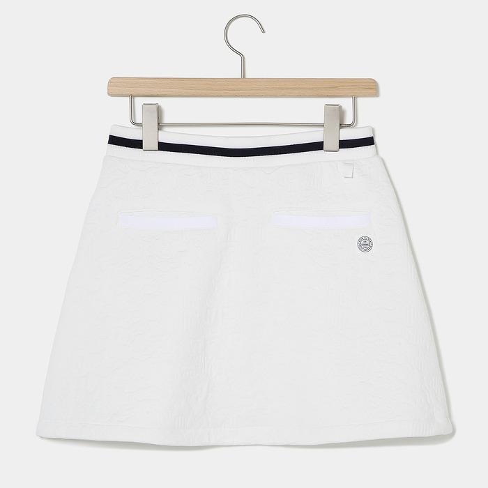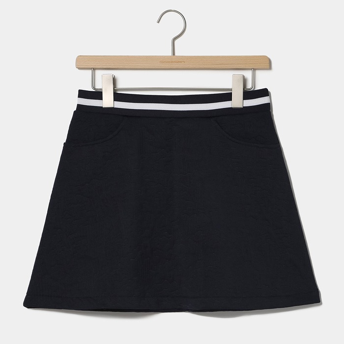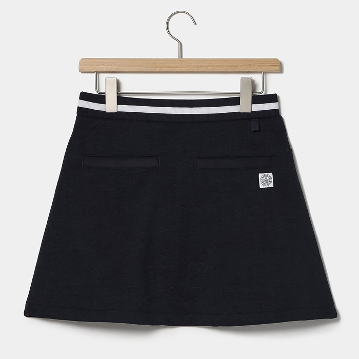 都会の輝きや光線をイメージした線画カモフラ柄をジャカードで表現した、軽量感と薄さを訴求したポリエステルのを使用。ウエストゴムのイージースカートで着脱もし易く、ウエストの配色ラインをアクセントにしたフレアシルエットのアイテム。単品だけでなく、お揃いのプルオーバーと上下セットのコーディネートもお勧め。