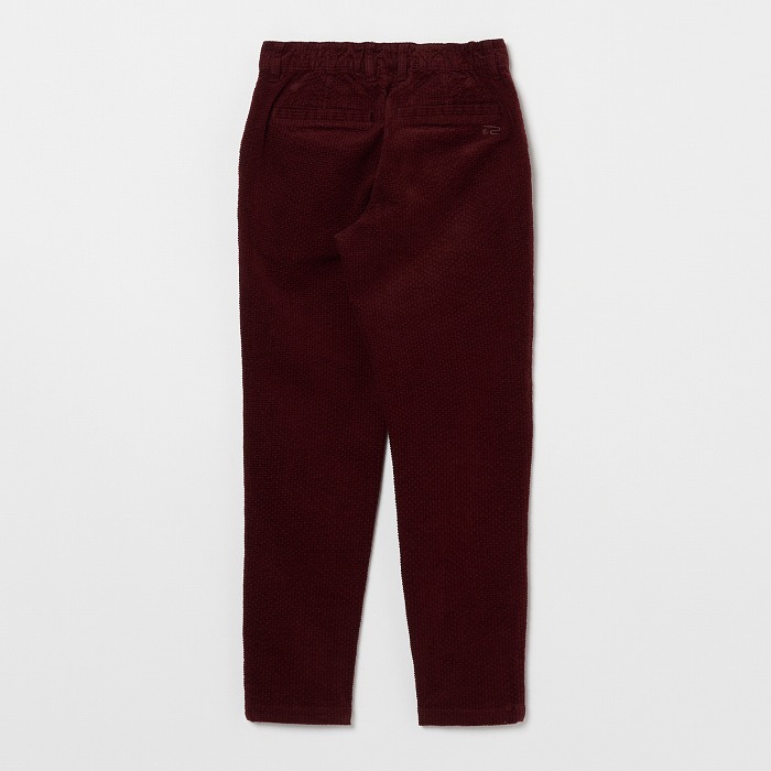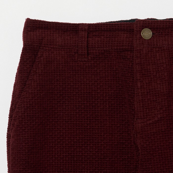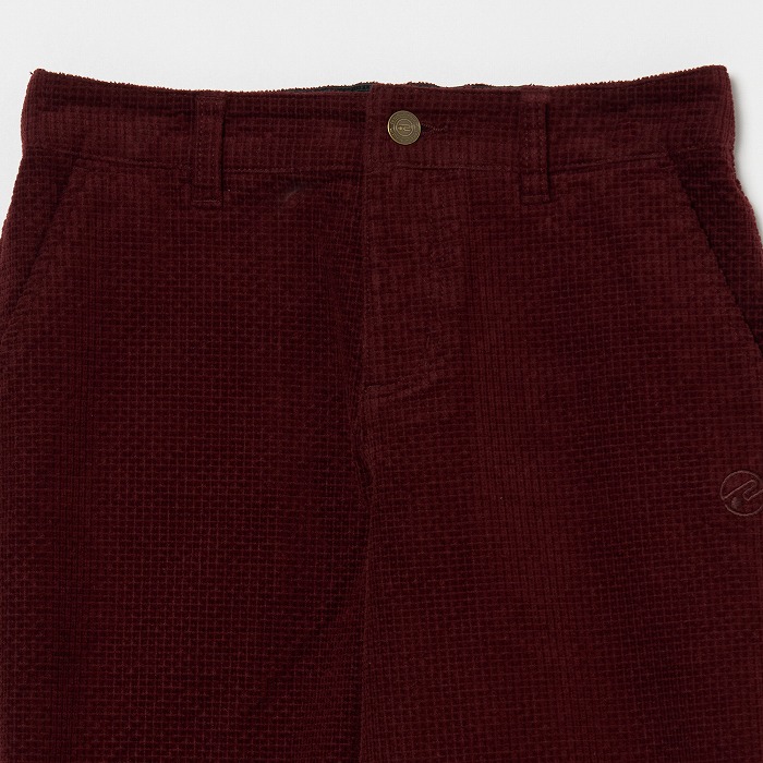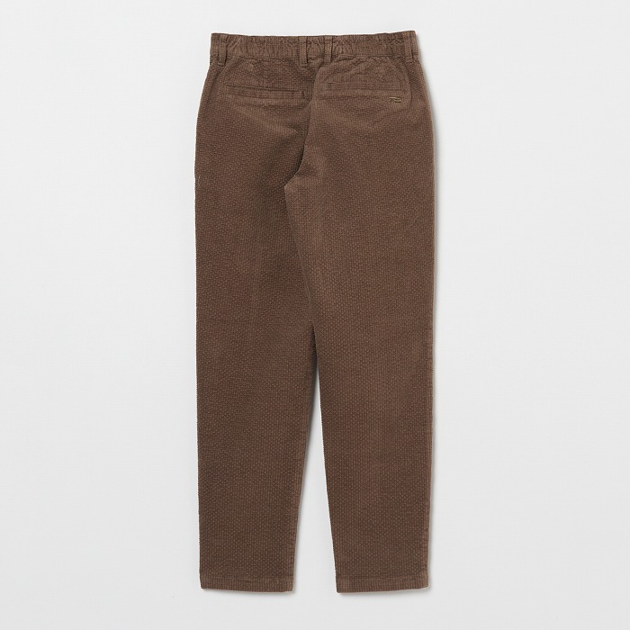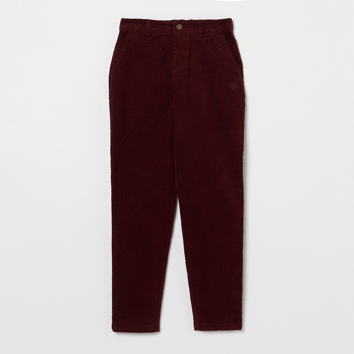 トレンド感のあるスタイリングが楽しめる、ストレッチ性のあるブロークンコーデュロイ素材を使用。後ウエスト裏は滑り止めのロゴプリントを入れたゴムを付け、屈む際シャツが出ない様に考慮した仕様がポイント。シンプルでデイリーユースにも重宝するテーパードシルエットの9分丈パンツ。