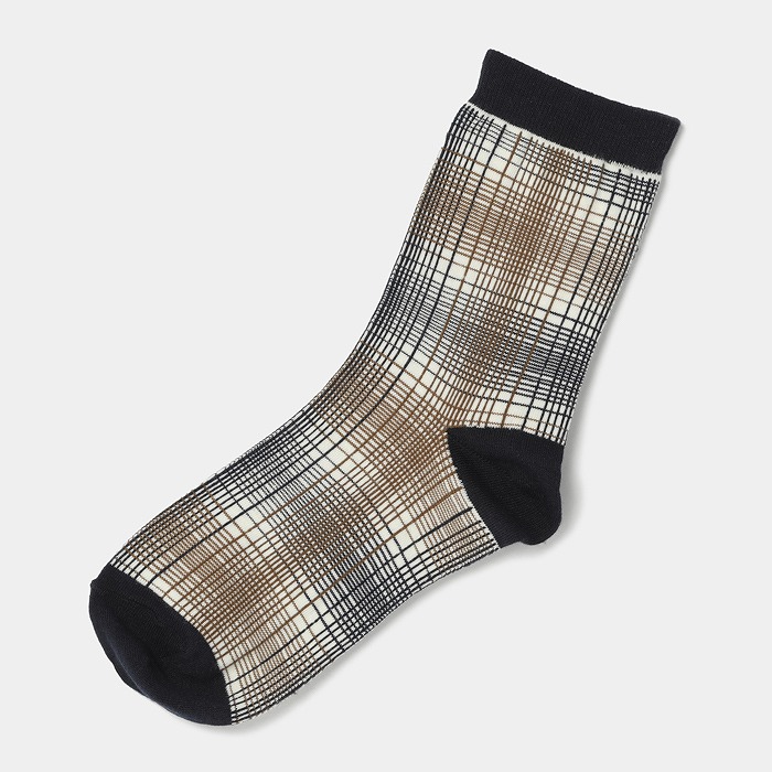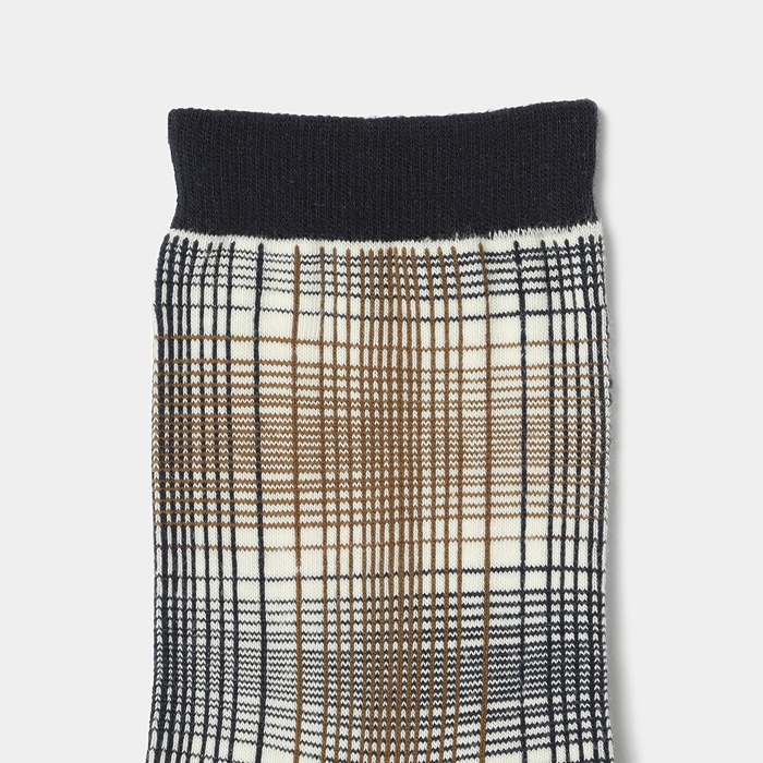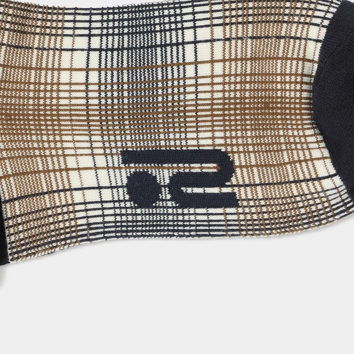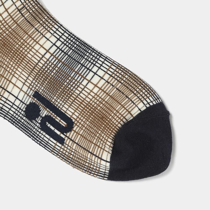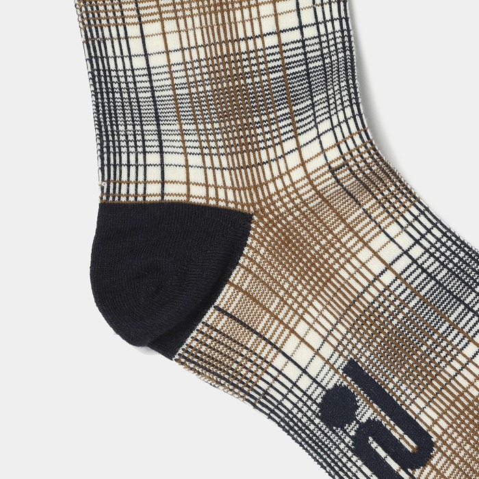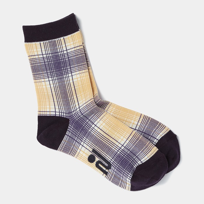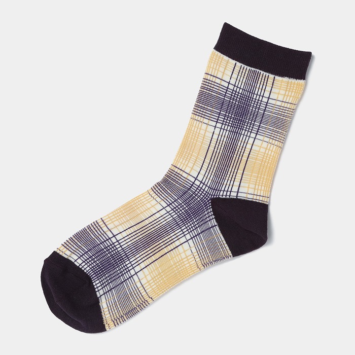 ウェアと同配色のチェック柄ソックス。シンプルなデザインながらも目を引く配色がポイント。あらゆるカジュアルコーディネートのアクセントになるアイテム。