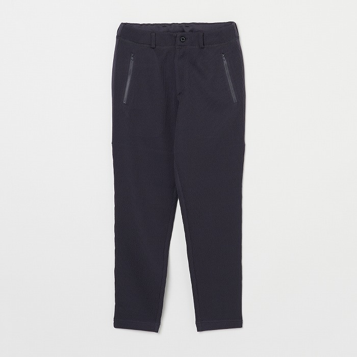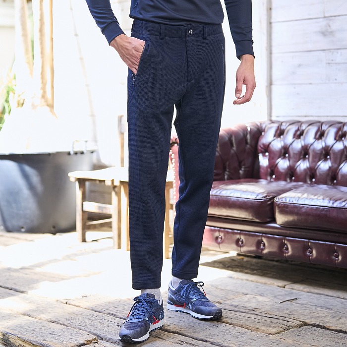 表地は8ゲージ、裏地は32ゲージの編み立てによる、こだわりの接結ジャージ素材を使用。ボンディング加工を施したような、ハリのある立体的なシルエットが特徴です。ニットのような上品な風合いながらも、軽快な着心地を実現しました。シワになりにくく、美しいフォルムをキープできるのもポイントです。さらに、カートに引っかかりにくいよう、ヒップ部分には滑らかなハイゲージ側を使用するなど、ゴルフシーンに嬉しい工夫も。