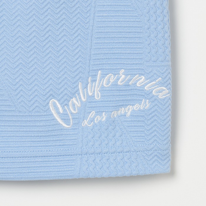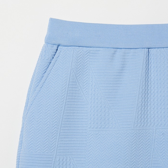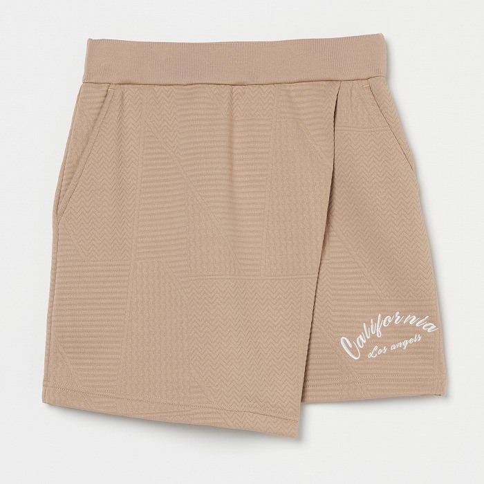 パッチワーク柄を表現した、膨れジャガード素材を使用したスカート。表面感のある個性的な素材が、周りと差をつけるおしゃれなアイテムです。左前と後ろポケットのロゴ刺繍がデザインのポイント。同素材のプルオーバーと合わせたセットアップスタイルもおすすめです。