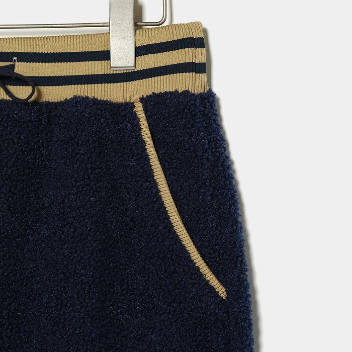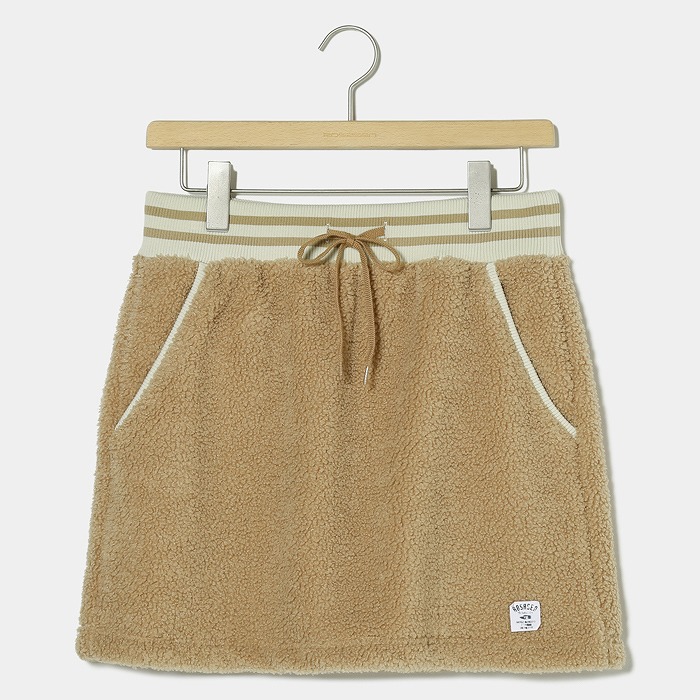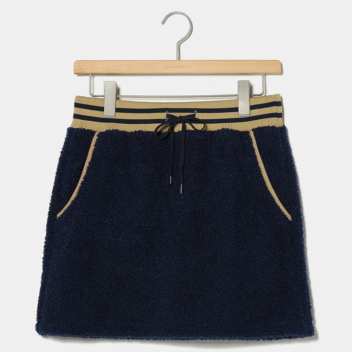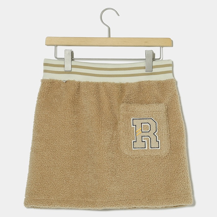 テディベアのような細かくカールしたボア生地を温かみのある色にしたスタジャン風スカート。後ろポケットにワッペン風の大き目のロゴを入れて大人カジュアルな仕上がりに。裏面は毛足の長いボアになっていてストレッチ性も抜群。一重で仕立てることで暖かくすっきりとしたアイテムに。ベスト、ブルゾンとのセットアップも単品でも合わせやすい商品です。