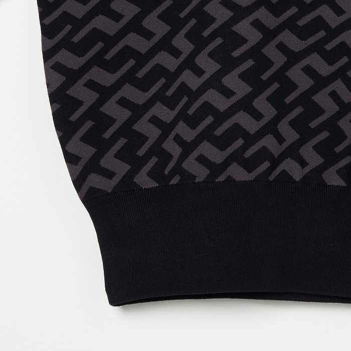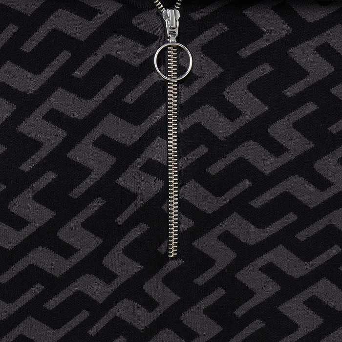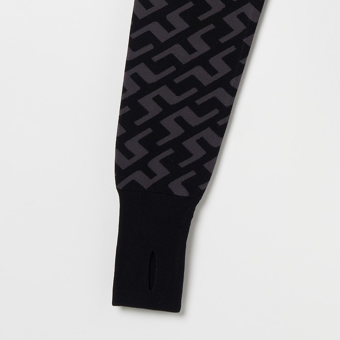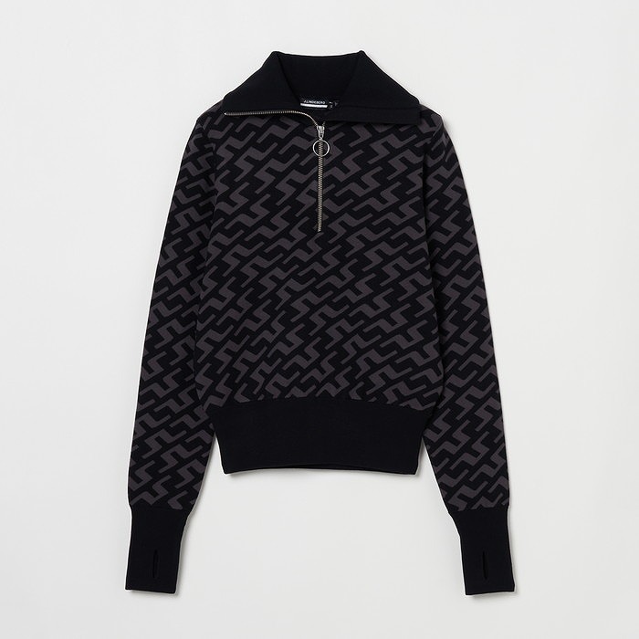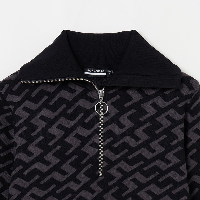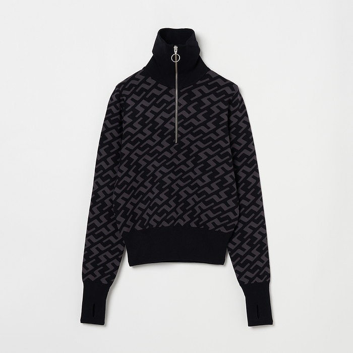 ブリッジマークをあしらった総柄ダブルニットジャガードのハーフジップセーター。裾、袖口、衿はリブ仕様。袖口はサムホール。ソフトな風合いの16ゲージダブルニット。