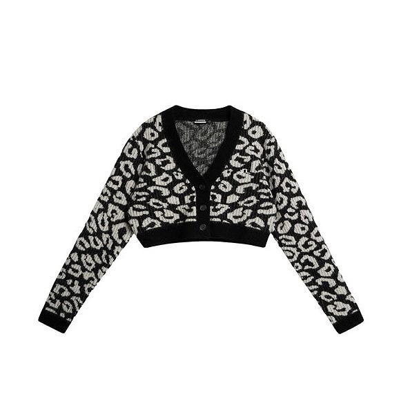 レオパード柄ジャガードのクロップドVネックカーディガンです。胸にブリッジロゴ、前立て3ボタンタイプ。