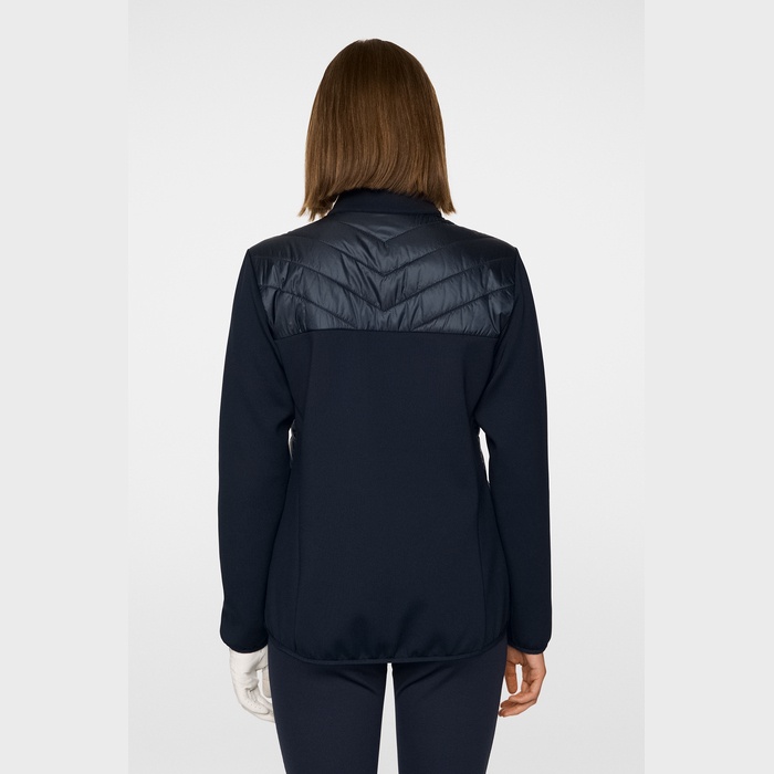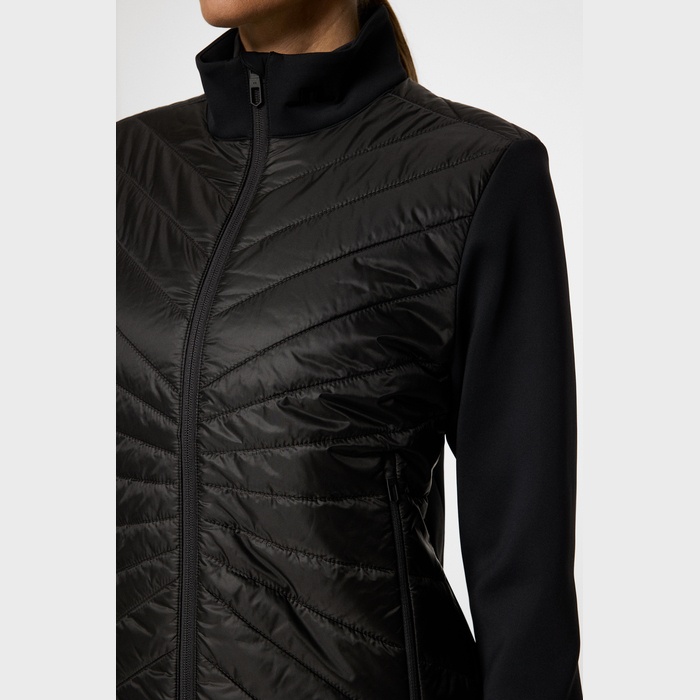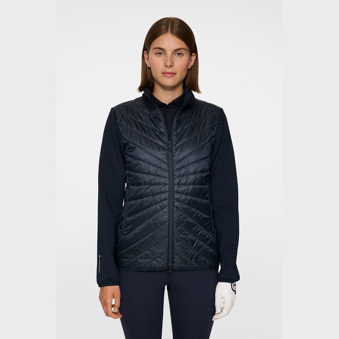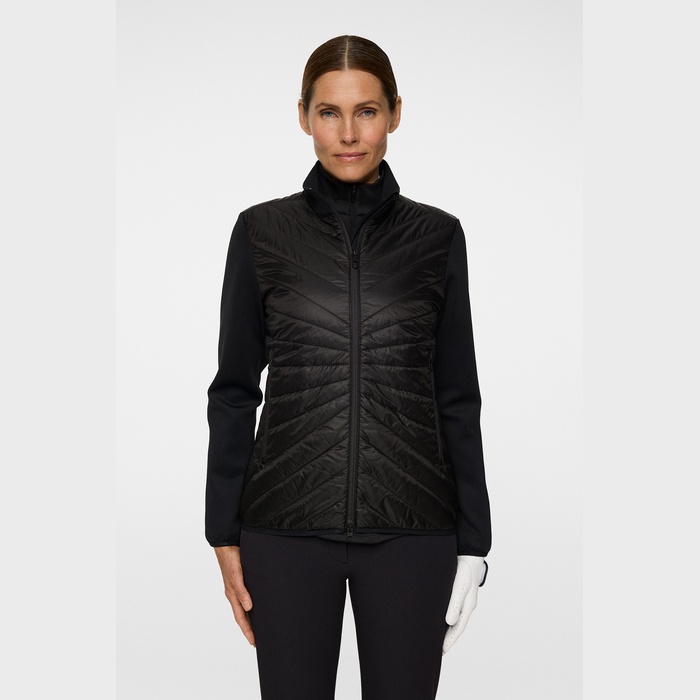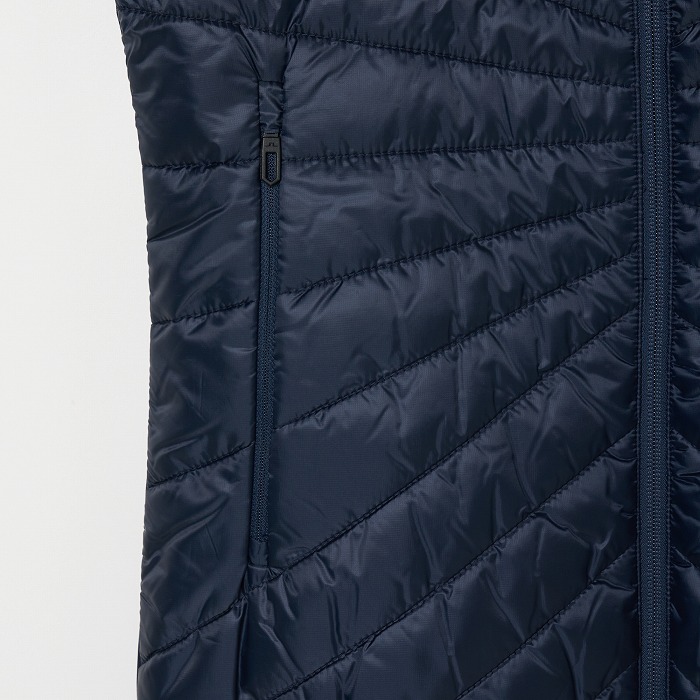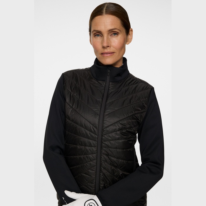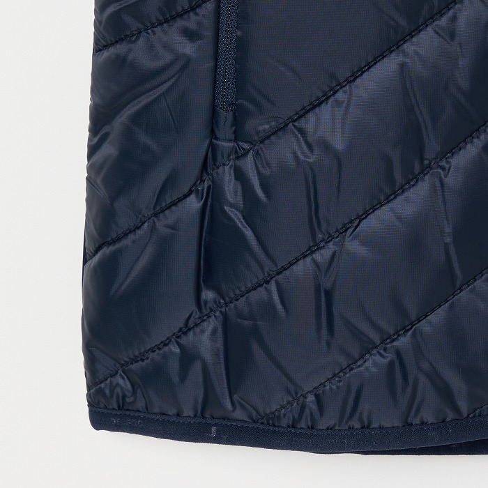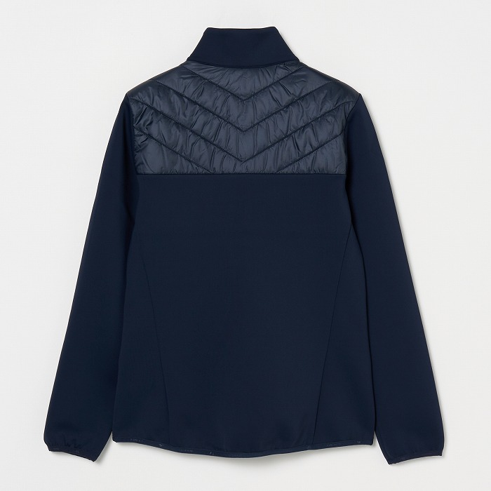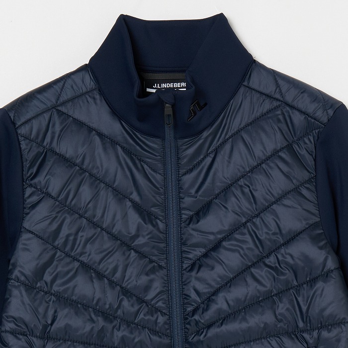 中綿キルトとニットのハイブリッドパデッドジャケットは、動きやすさを追求した柔軟な生地でデザインされています。コース内外で活躍する万能アイテムです。フロントは2ウェイジッパーを採用し、ジッパー付きハンドポケットを備え機能性も抜群。キルト部分には撥水性、ニット部分にはストレッチ、速乾性の機能が付き快適な着心地を提供します。襟にはブリッジロゴが付きます。撥水加工は環境に配慮したPFCフリー加工で、エコテックス認証済みとなります。