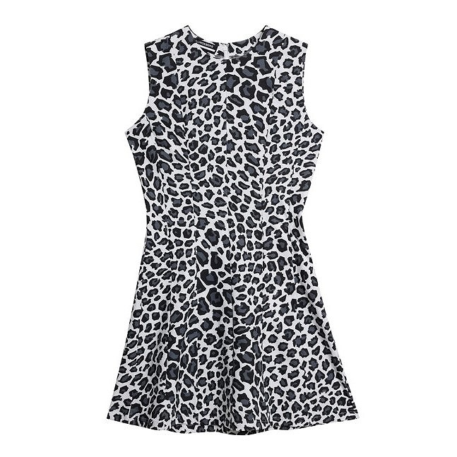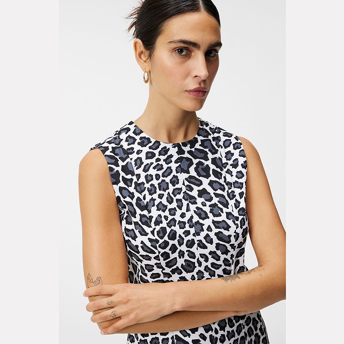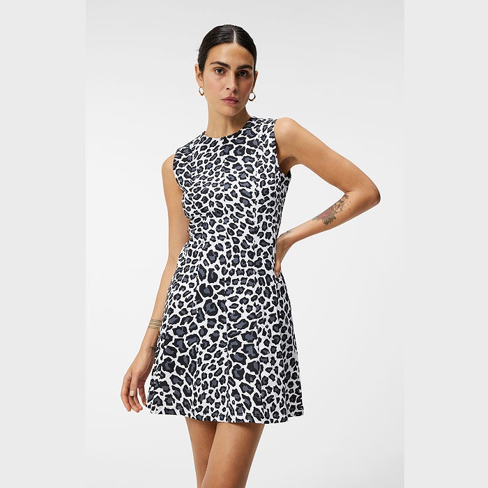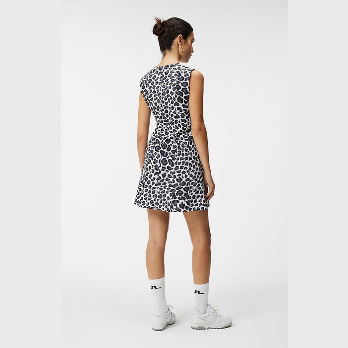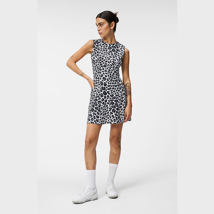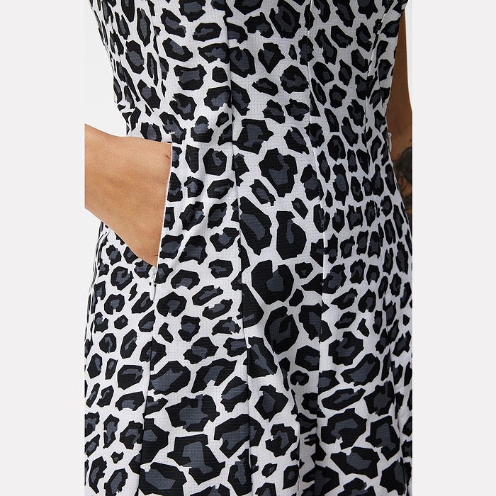 全面にレオパード柄がプリントされたフェミニンなノースリーブワンピース。インナーショーツ付きです。サイドにシームジップポケットがあります。4ウェイストレッチ