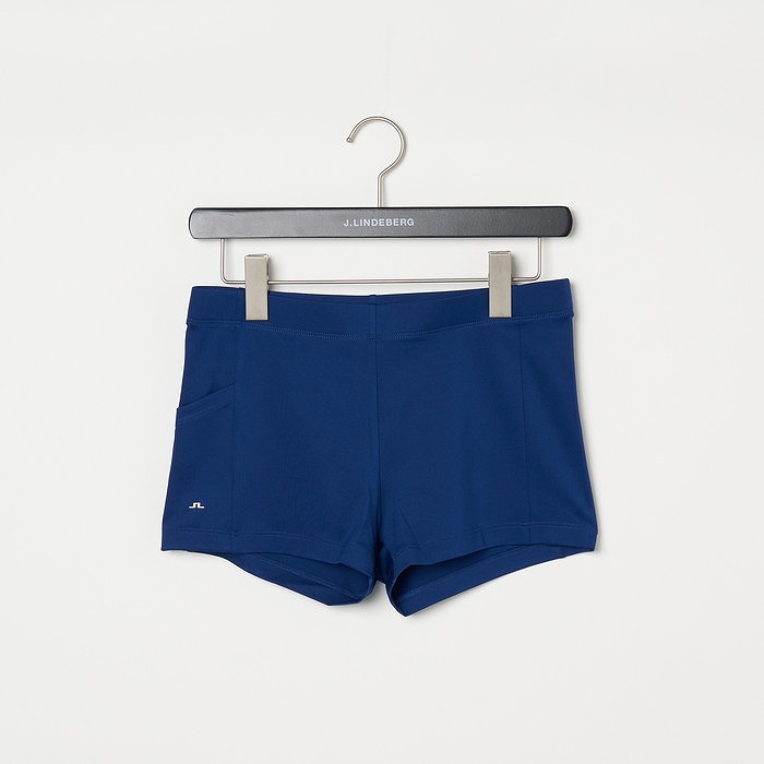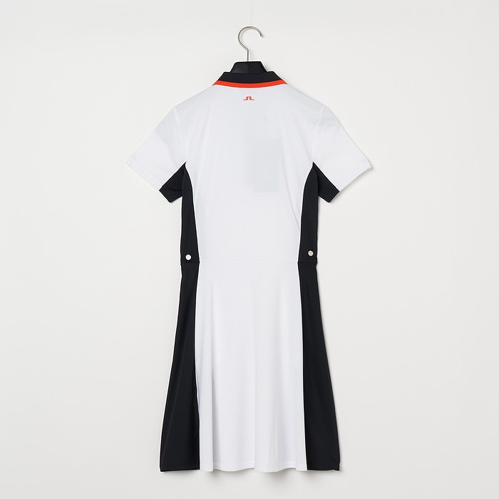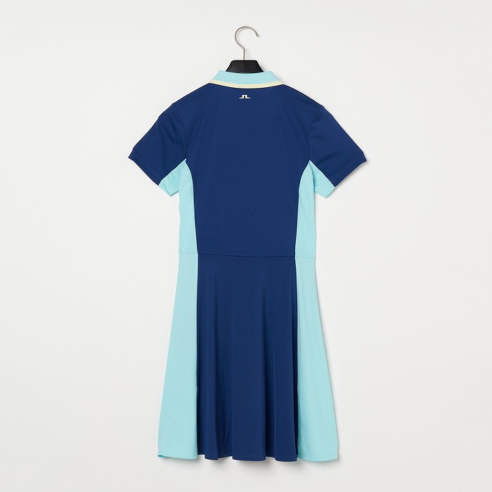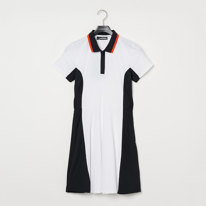 ストライプのジャガード襟、脇のカラーブロックが特徴のスポーティなワンピース。前立ては3つボタンの比翼仕立てタイプ、ジッパー付きのサイドポケットあり。インナーショーツ付き。素材特性としては、4WAYストレッチ、速乾性もあり、生地はエコテックス認証済みとなります。