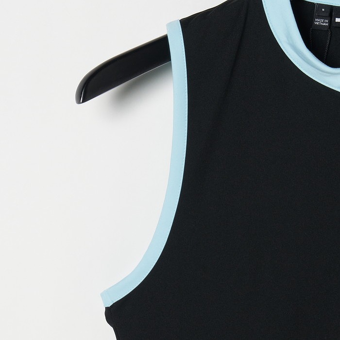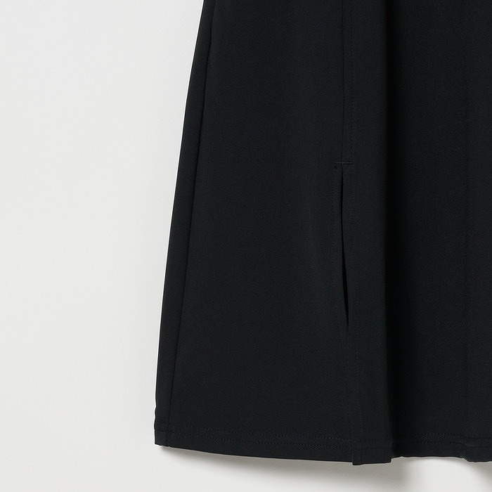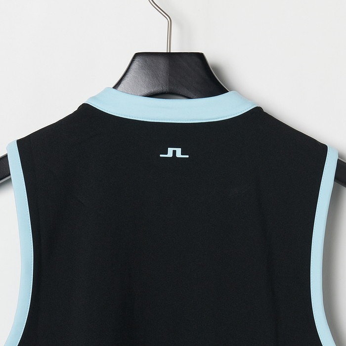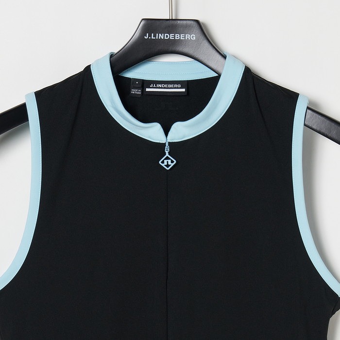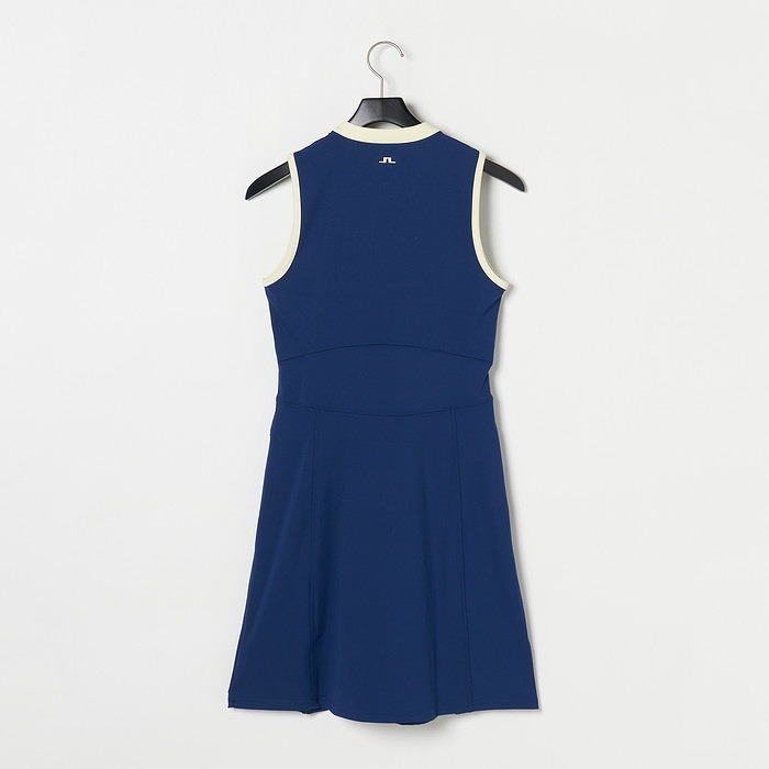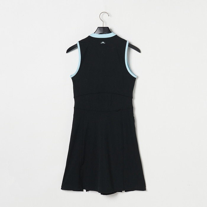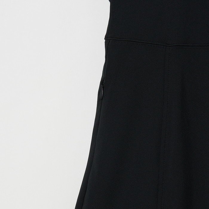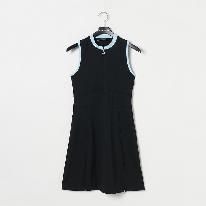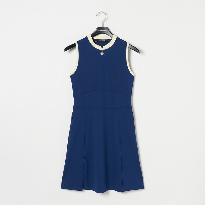 ボンバー襟が特徴のノースリーブワンピース。ハーフジップ明きでファスナーにはダイヤモンドブリッジロゴの引き手付き。ジッパー付きのサイドポケットあり。インナーショーツ付き。素材特性としては、4WAYストレッチ、速乾性もあり、生地はエコテックス認証済みとなります。