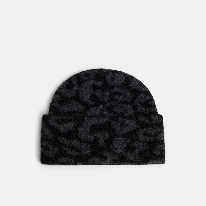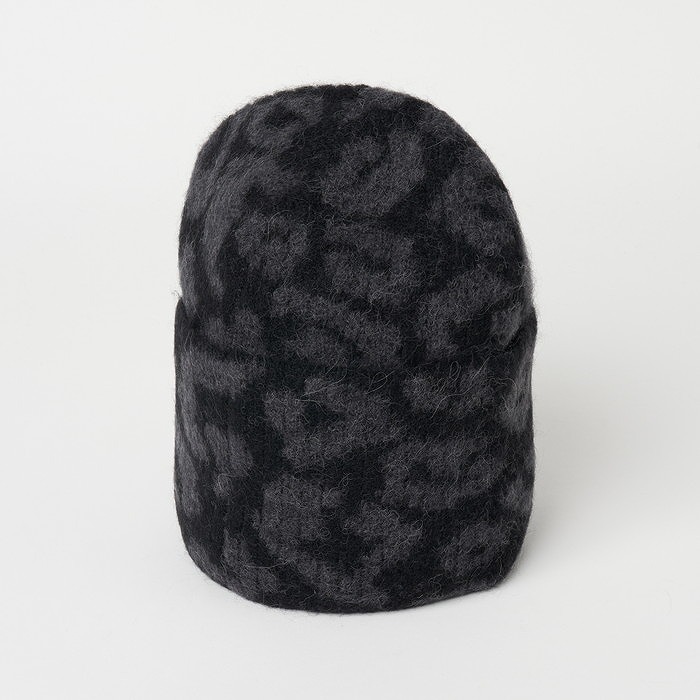 レオパード柄ジャガード、前面にはブリッジロゴ刺繍がついたビーニーです。オーバーサイズフィット、素材は毛100%。