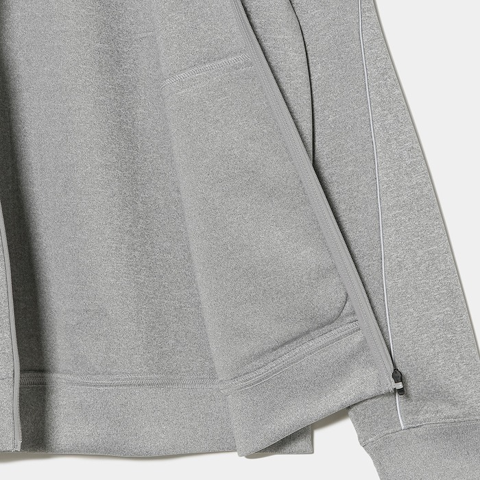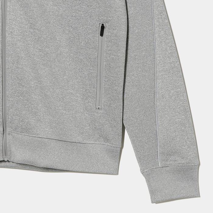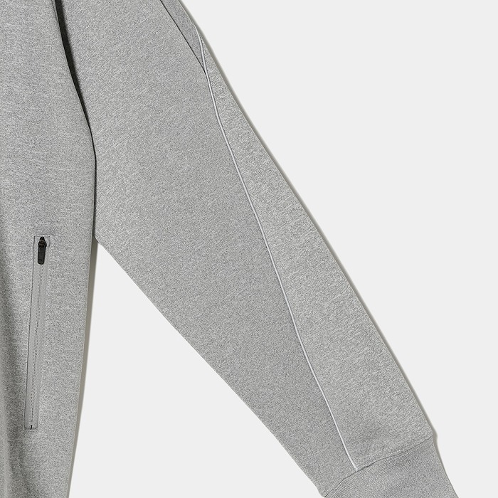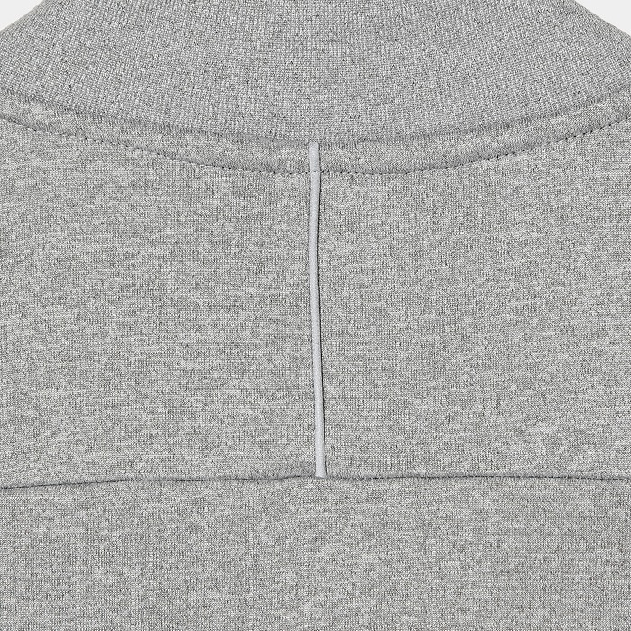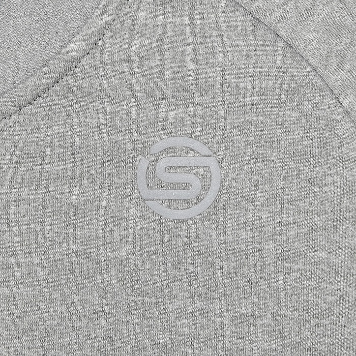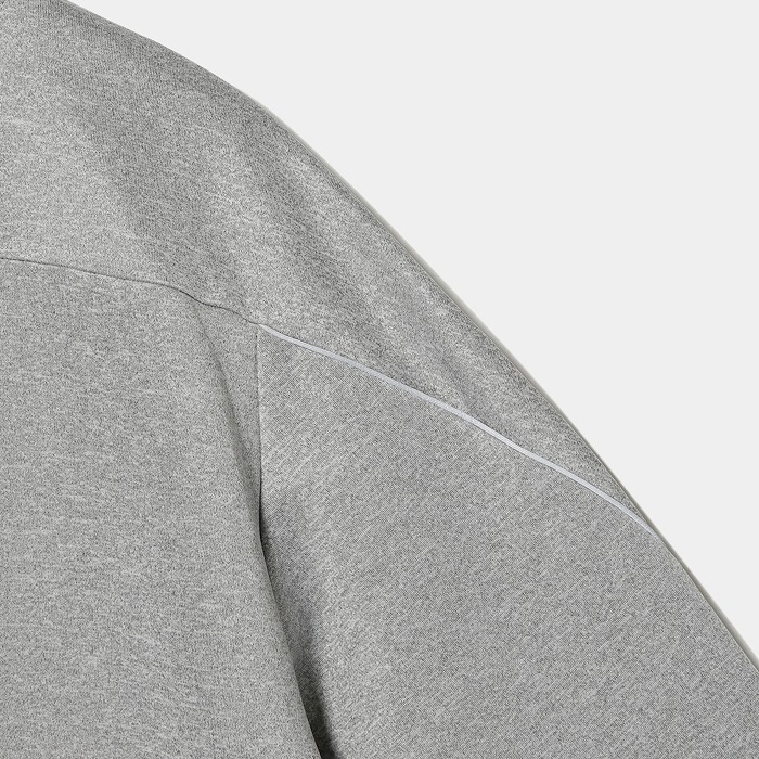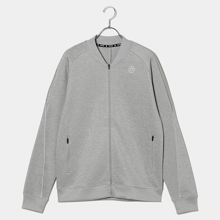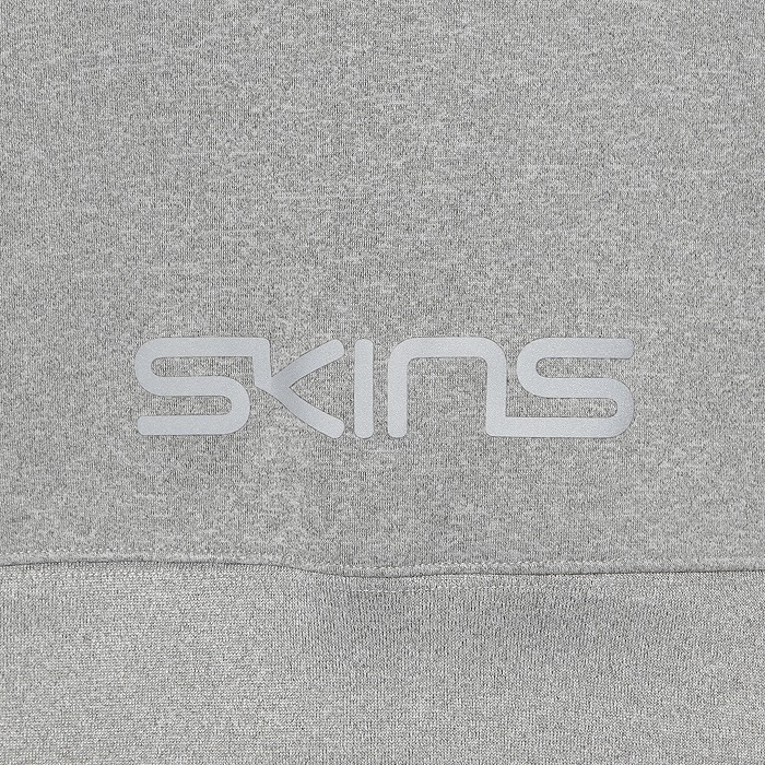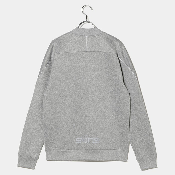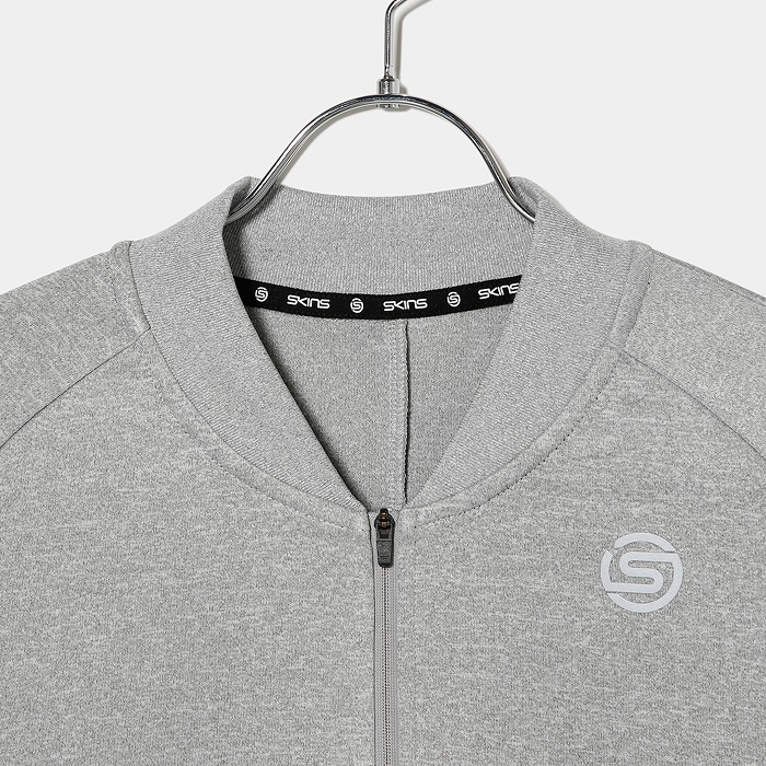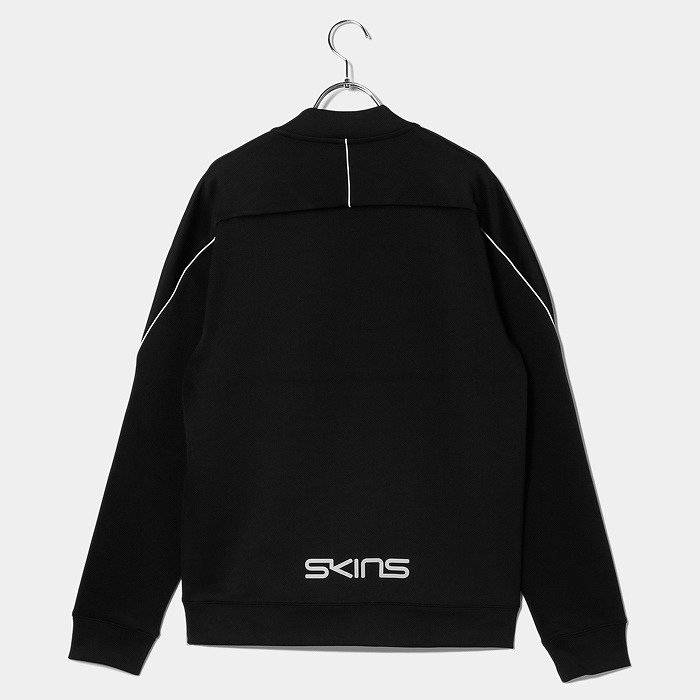 フューチャー感ある素材でシンプル見えするトラックジャケットです。カッティングにこだわって居り、後肩部分から袖口に向かって再帰反射のパイピングが斜めに切り替えています。後中心上部にもパイピングが入っています。左肩部分のSマーク、後裾リブ部分の大き目のSKINSロゴは再帰反射プリントとなって居り、全体的に夜間の移動やトレーニングでの視認性に特化されたジャケットとなって居ます。