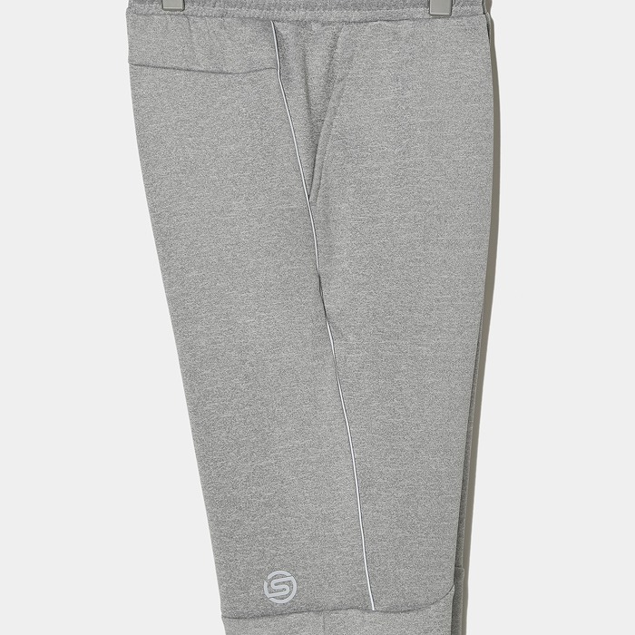 フューチャー感ある素材でシンプル見えするトレーニングパンツです。カッティングにこだわって居り、後腰部分から膝上に向かって再帰反射のパイピングが斜めに切り替えています。左裾部分のSマーク、左足裾部分の大き目のSKINSロゴは再帰反射プリントとなって居り、全体的に夜間の移動やトレーニングでの視認性に特化されたトレーニングロングパンツとなって居ます。