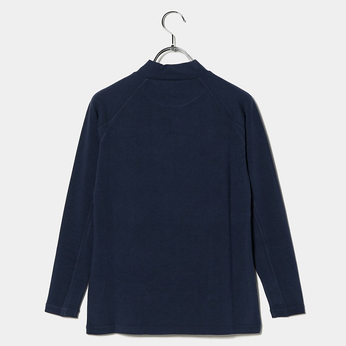 アクリル・レーヨン素材で柔らかく肌あたりの良い素材でモックネックシャツを。吸湿発熱性も兼ね備えており冬のランニングでは重宝します。衿のSマーク、右袖口のSKINSマークには再帰反射になっており、夜の視認性も確保しています。