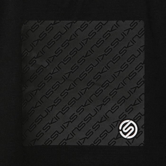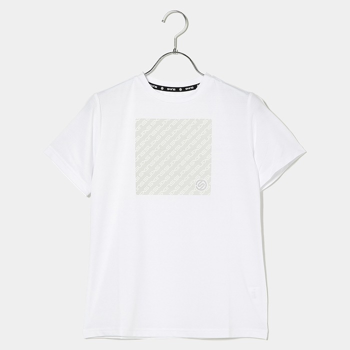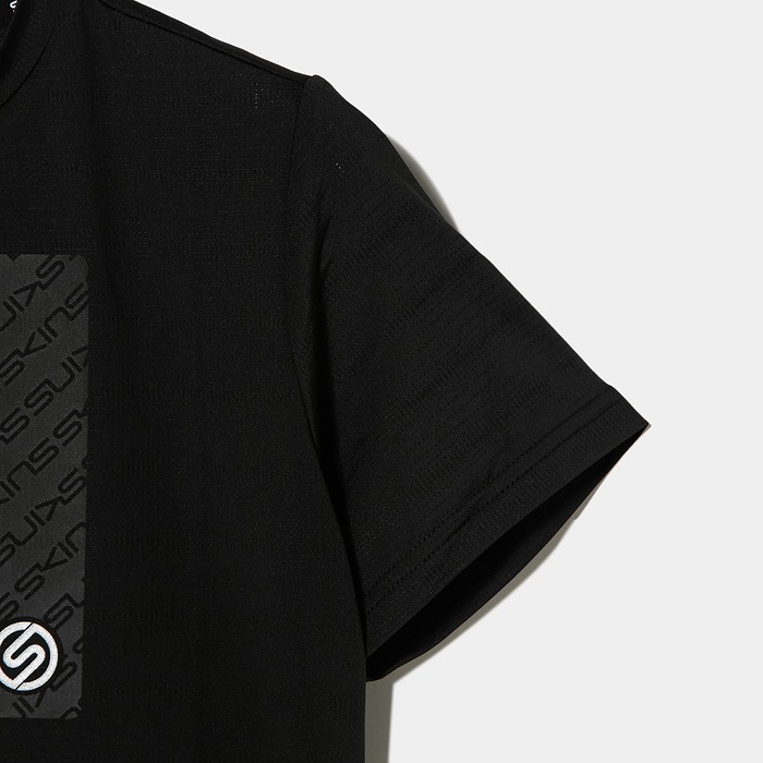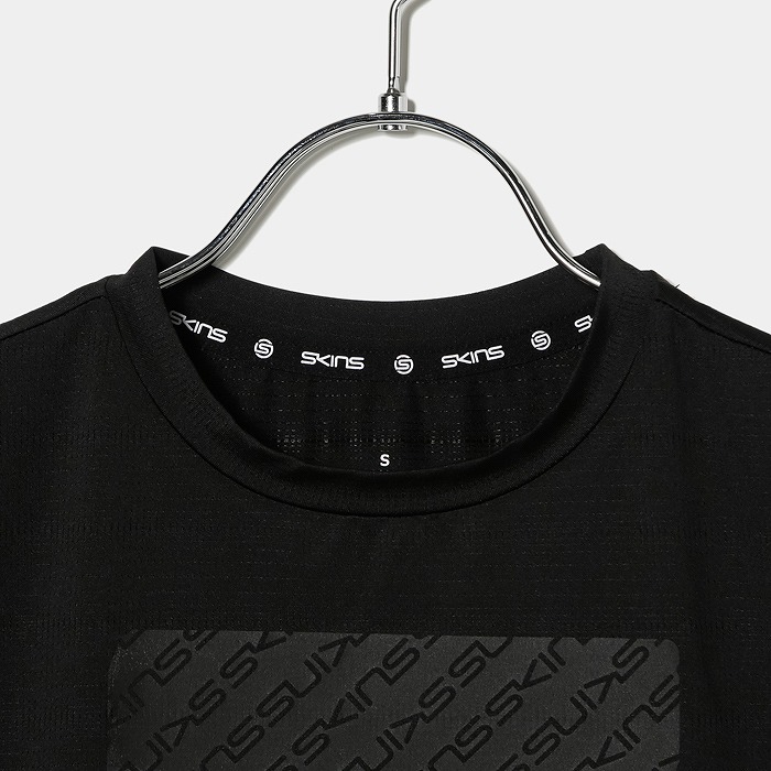 Tシャツプリント史上初の吸水するプリントを胸に配したSKINSロゴTシャツです。吸水する事で今まで大きな胸ロゴで不快だったムレを軽減し、快適にお過ごし頂けます。Sマークは再帰反射プリントになって居り、夜間の視認性を確保しています。