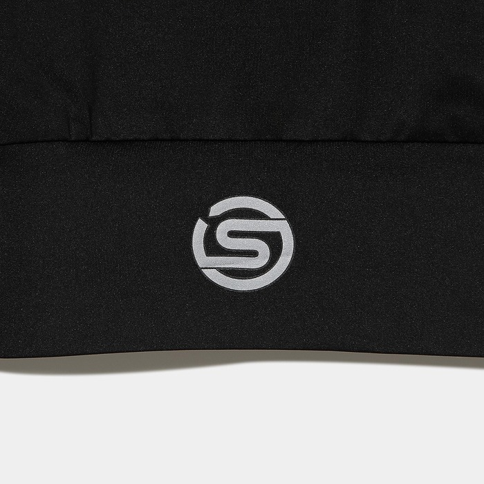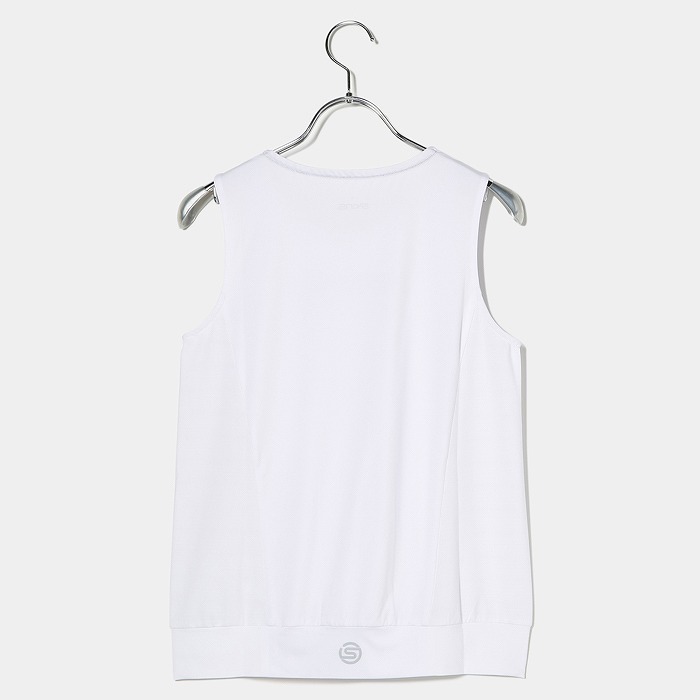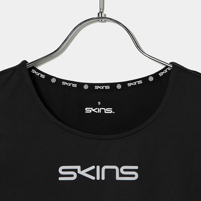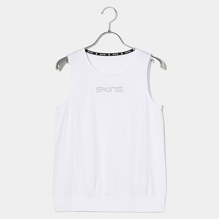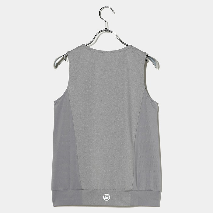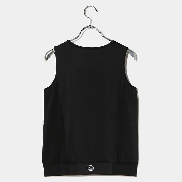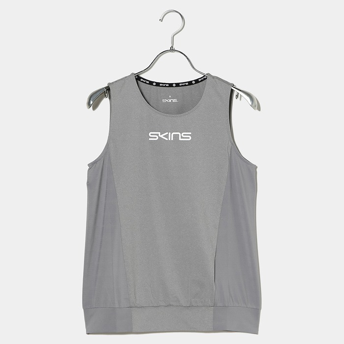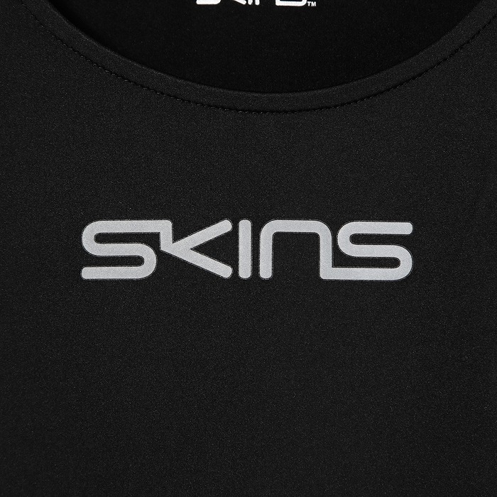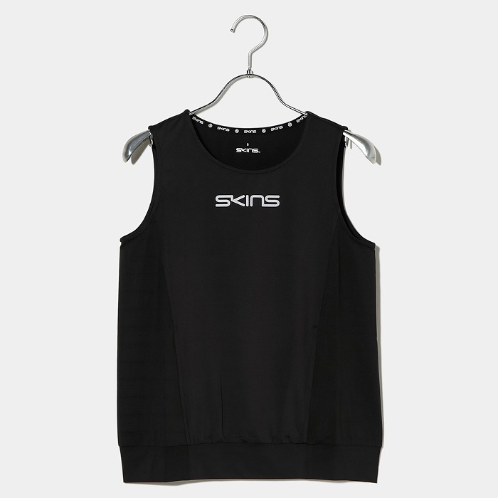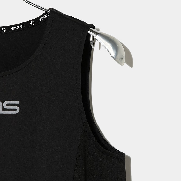 2種類の素材で厚みを加えたノースリーブシャツです。コンプレッションウェアに合わせご着用頂きたい逸品です。胸のSKINSロゴ、後裾中央のSマークは再帰反射となって居り、夜間の視認性を確保して居ます。