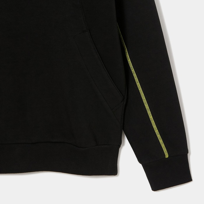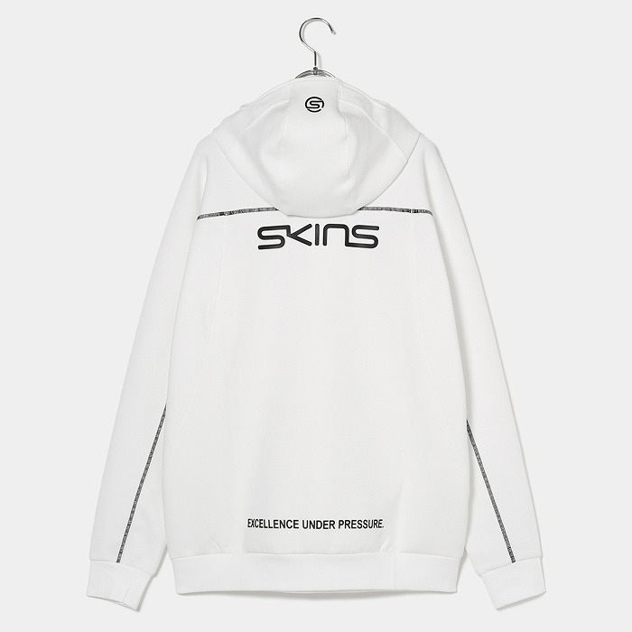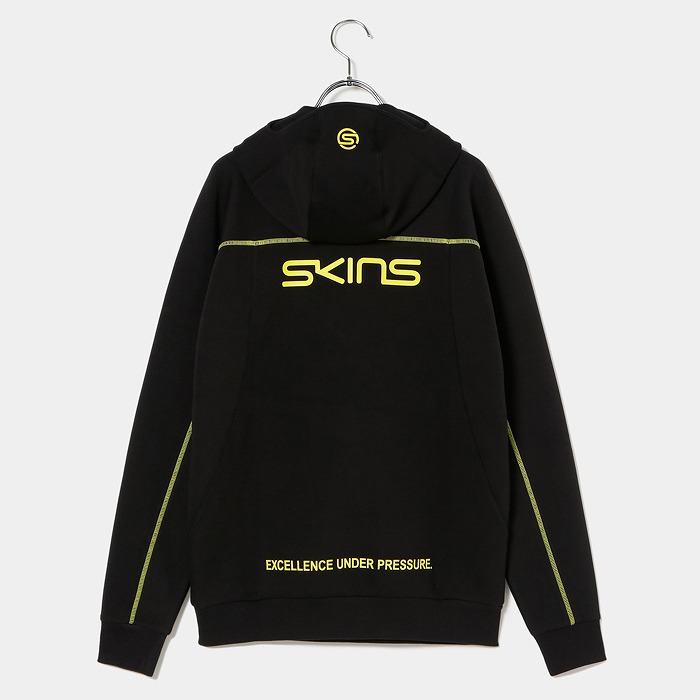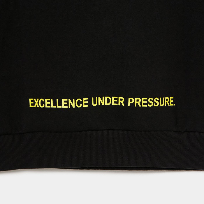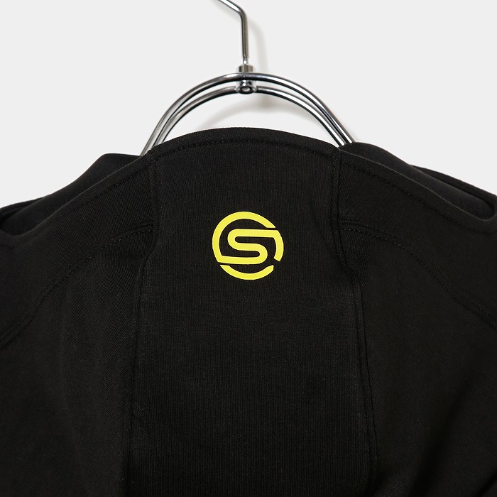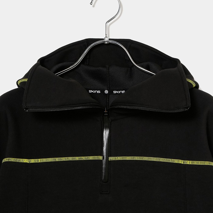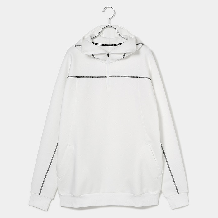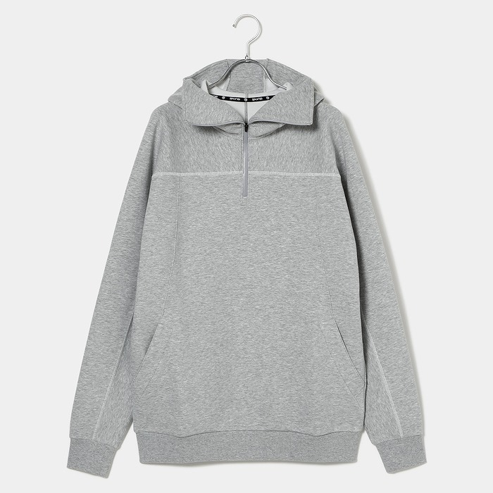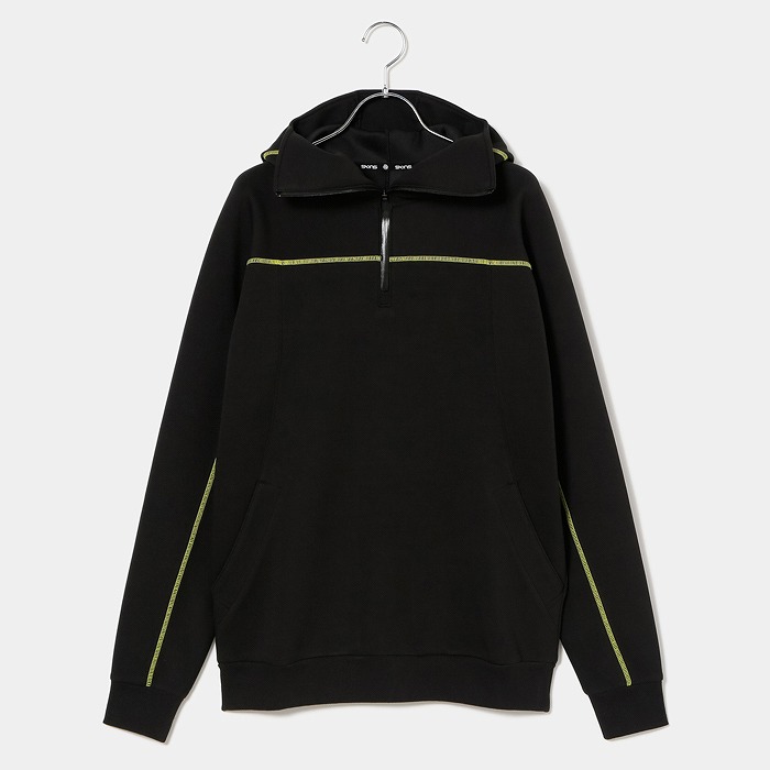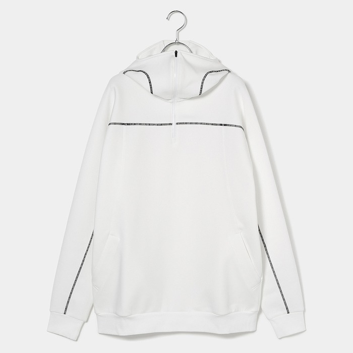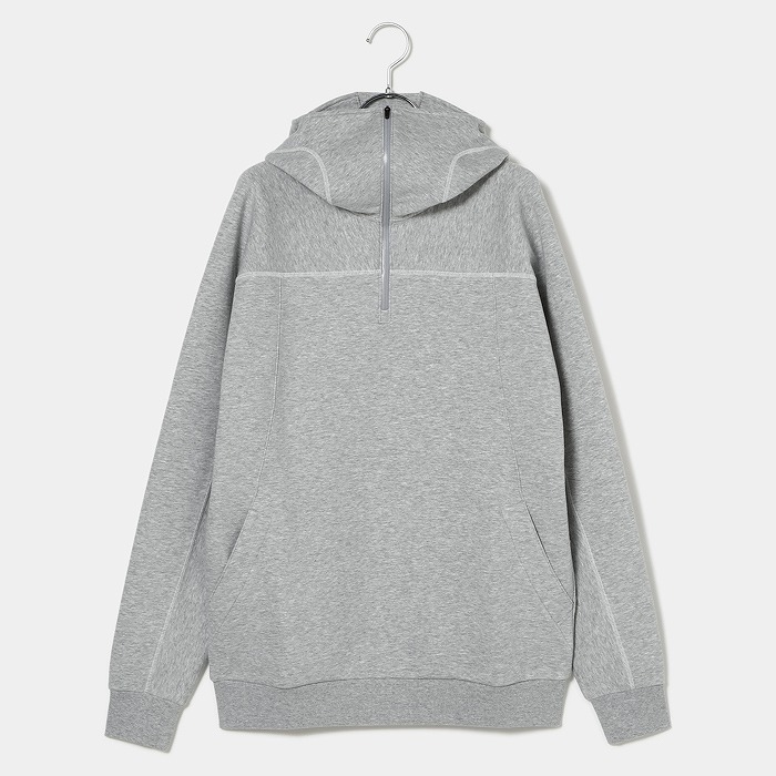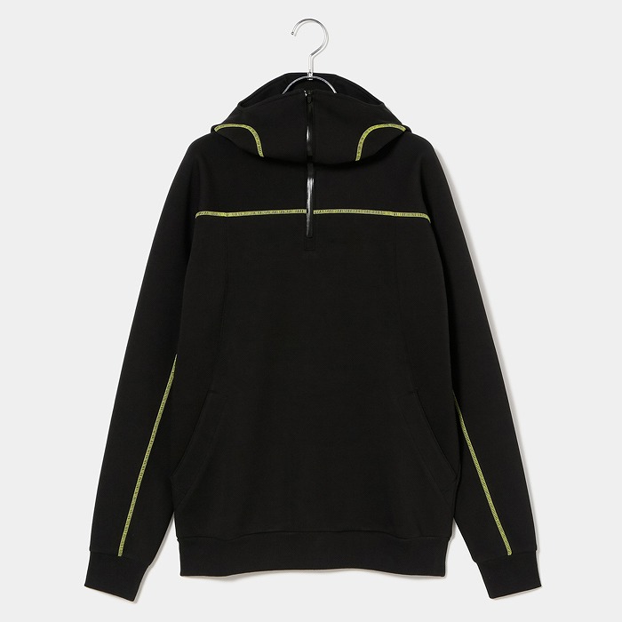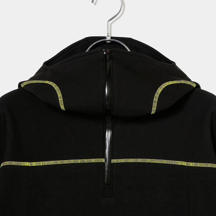 肌触りの良い適度なふくらみ感が特徴なダンボールニット素材で、今回のテーマである黒の騎士団をイメージさせるフーディーミドラーです。フード前明き部分も高めに設定されており、まるで西洋甲冑の様な着こなしが可能です。インパクトある配色ステッチとモチーフは甲冑に使われる装飾を表現しています。機能性と強さを表現ています。