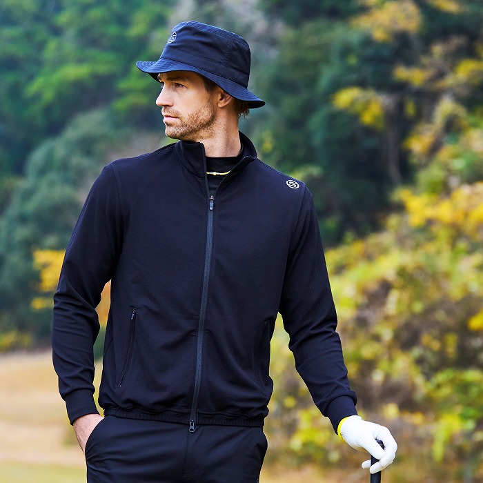 火山灰やココナッツ由来炭をポリエステルに練り込んだ37.5テクノロジー素材を使用し、快適性を追求したブルゾンです。トレンド感あるシルエットと前袖がセットイン袖、後ろ袖がラグラン袖のスプリットラグラン袖という仕様で、前身頃がモタ付かずスッキリと着用していただけます。後ろ身頃ではスイングの可動域を広げ、快適にプレイいただけます。左肩口の〇Sモチーフや後腰部分のSKINSマークはアイコニックな再帰反射プリントになっており、ナイトゴルフにも対応しています。制電テープも備えており、コンプレッションインナーやその他ウェアとの相性も考えられた機能も備えています。